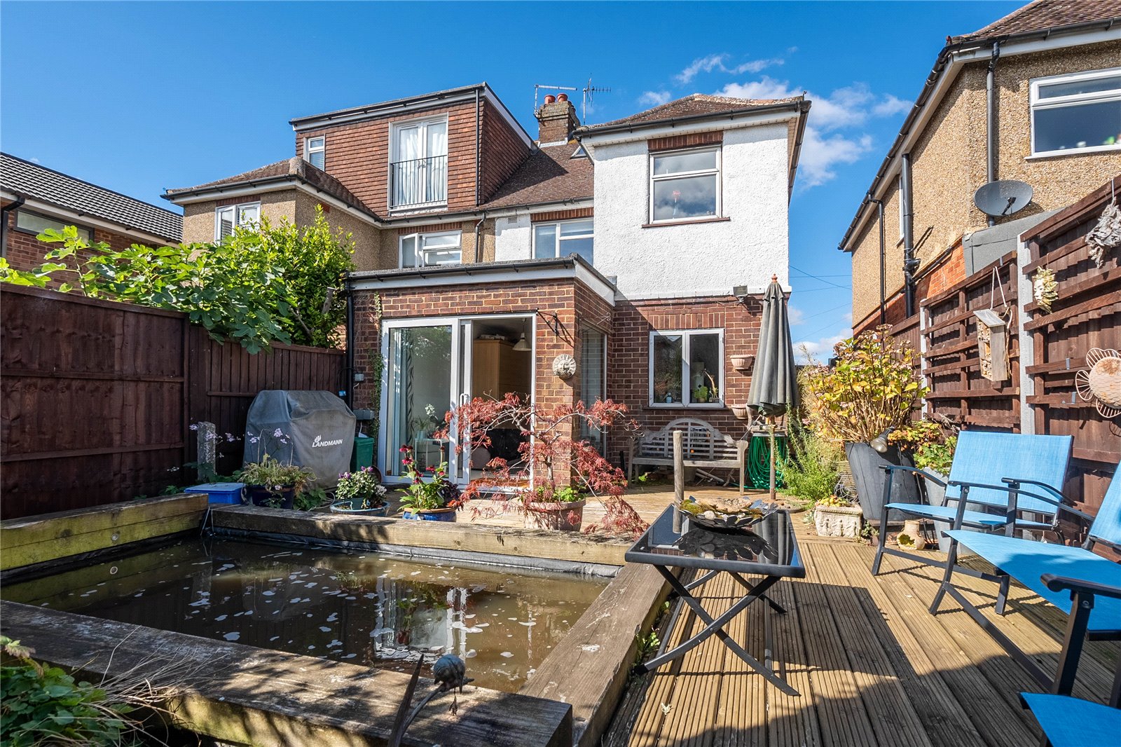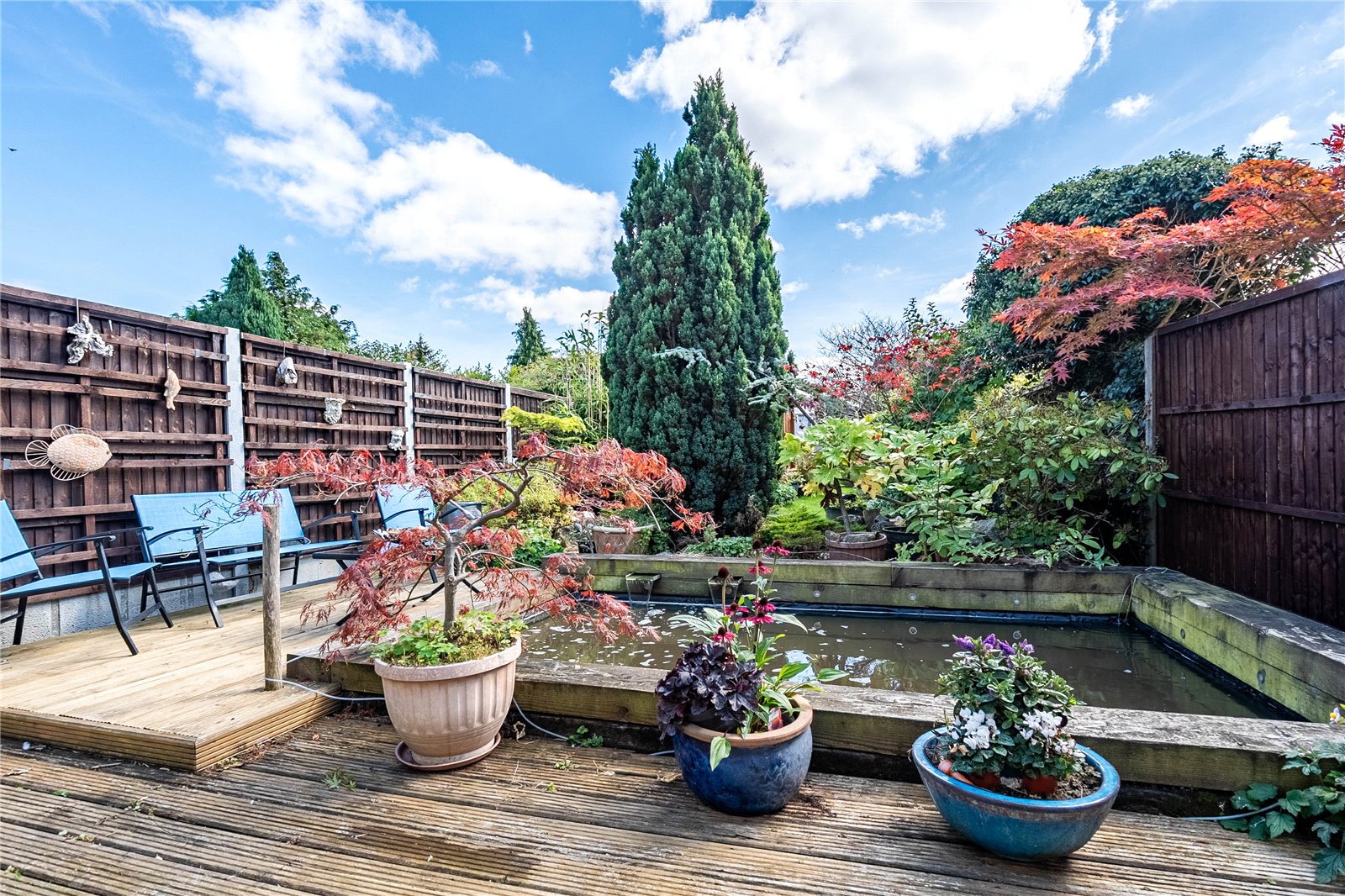 As mentioned, the rear garden is a large size and is south-easterly facing. There is a feature pond and plenty of room for kids and dogs to run around in. The front is predominantly block paved driveway space for several vehicles.