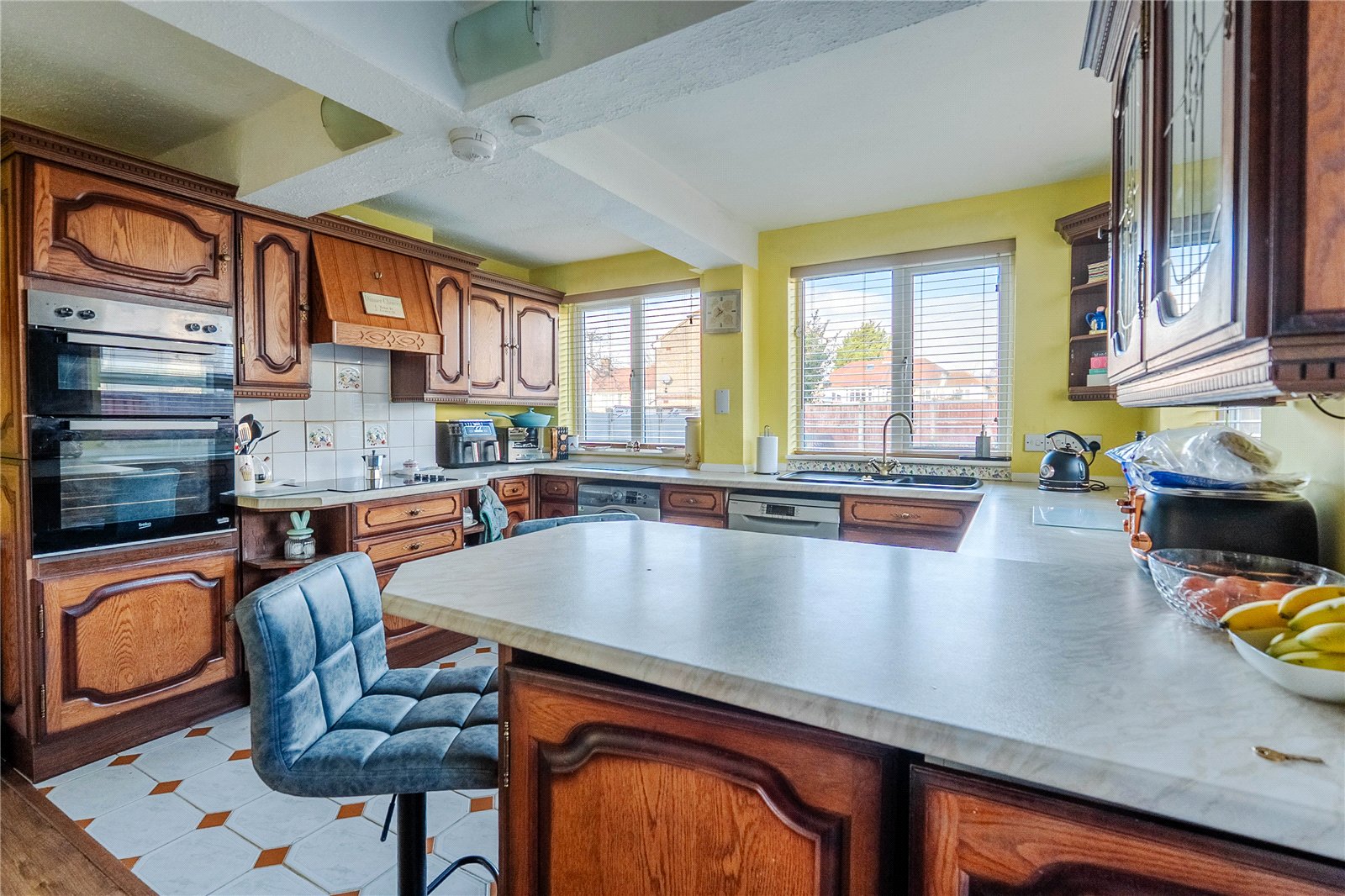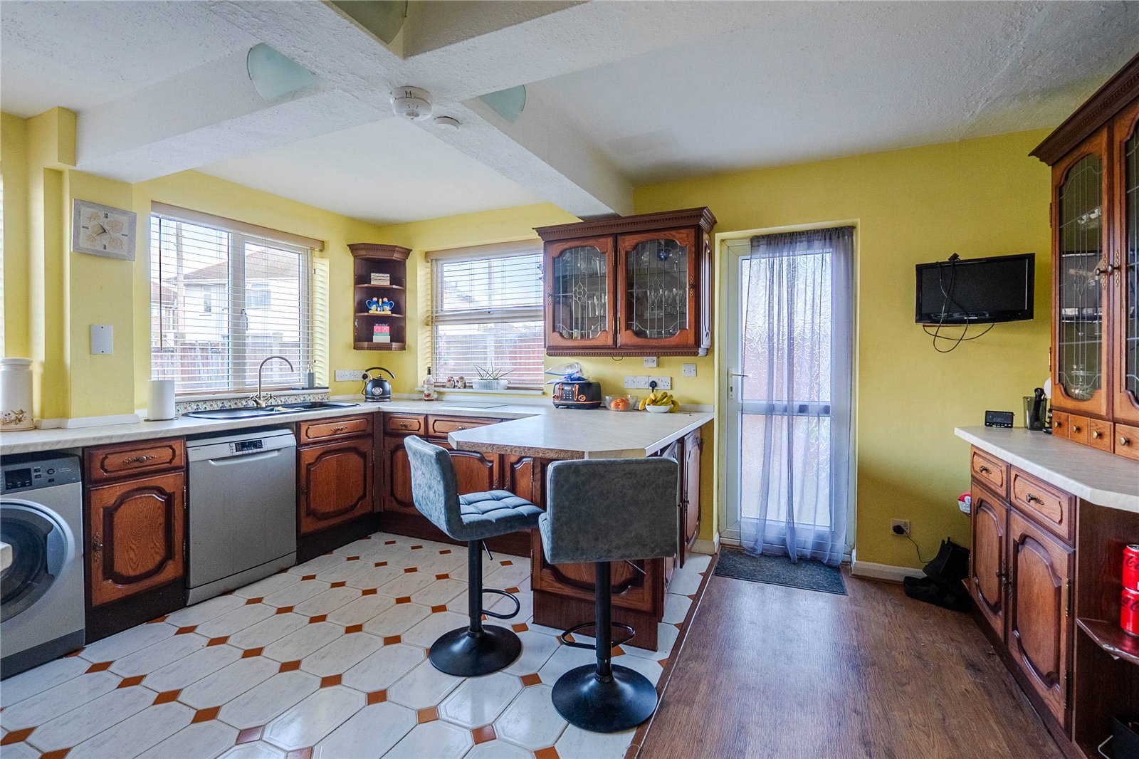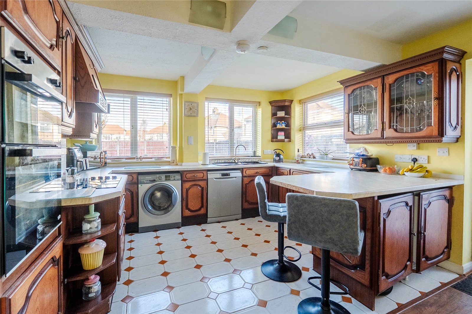The extended kitchen is also positioned at the rear of the property and offers ample worktop and storage space, a breakfast bar and additional access to the garden.
