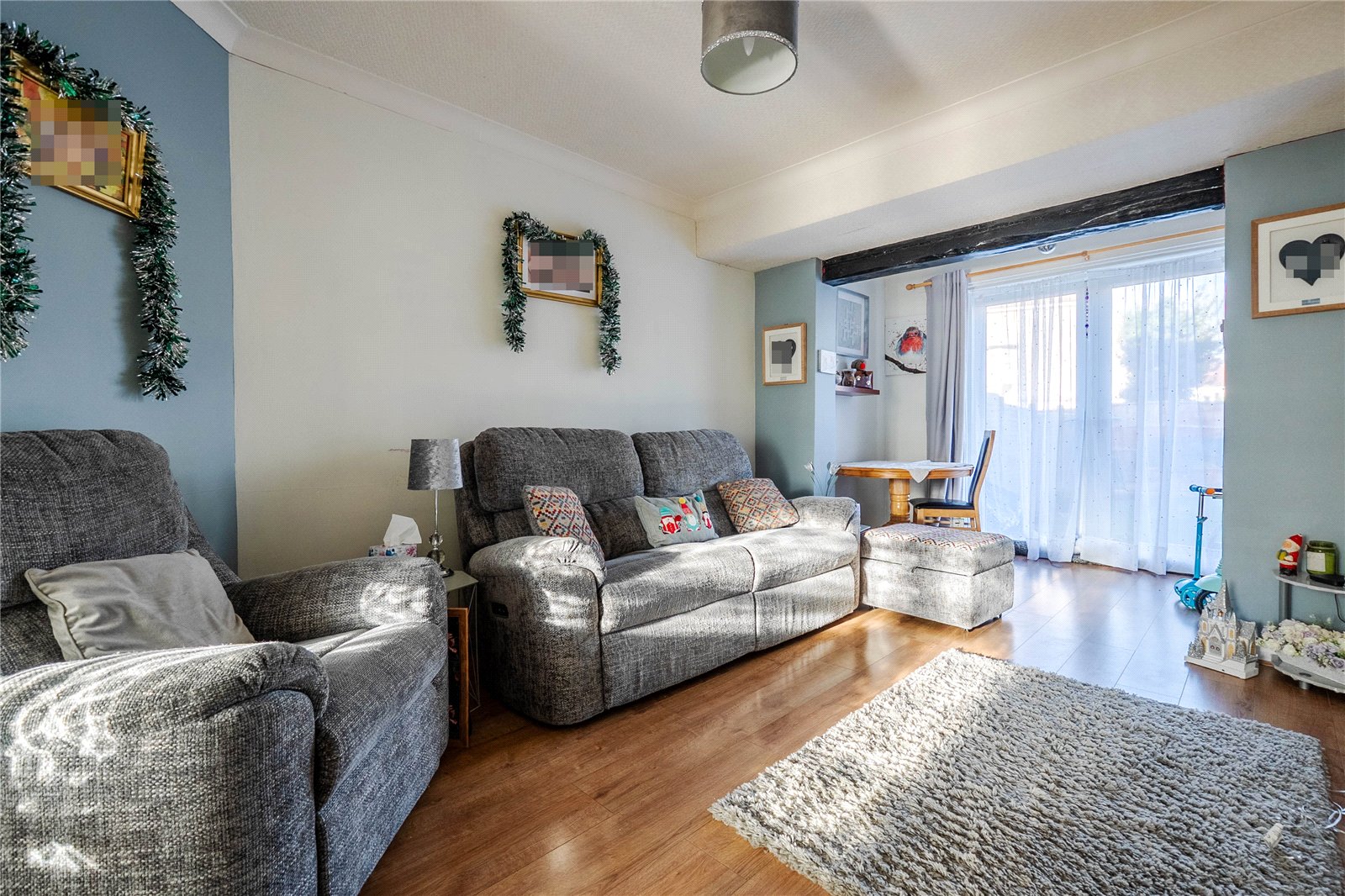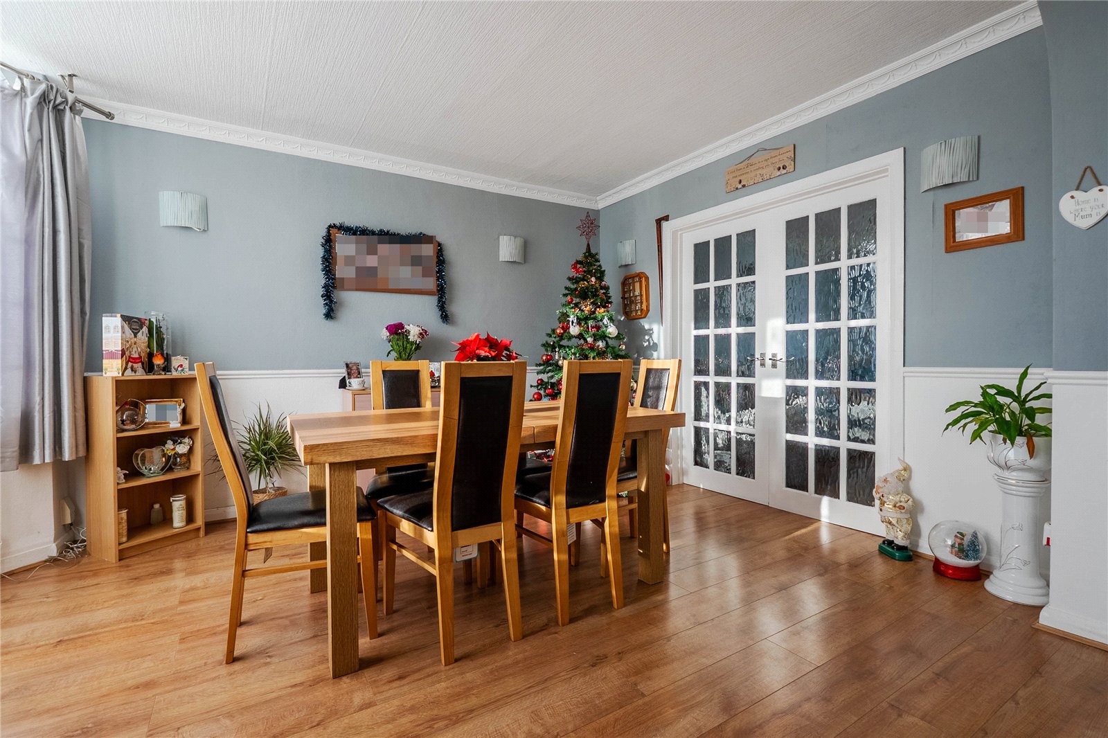 An entrance porch leads into a spacious reception room, currently used as a dining room, featuring a bay window that fills the space with natural light. Double doors open into a second, equally impressive reception room which has been extended to the rear and is presently used as the main lounge. This room benefits from further double doors opening directly onto the rear garden, creating a wonderful flow for everyday living and entertaining.