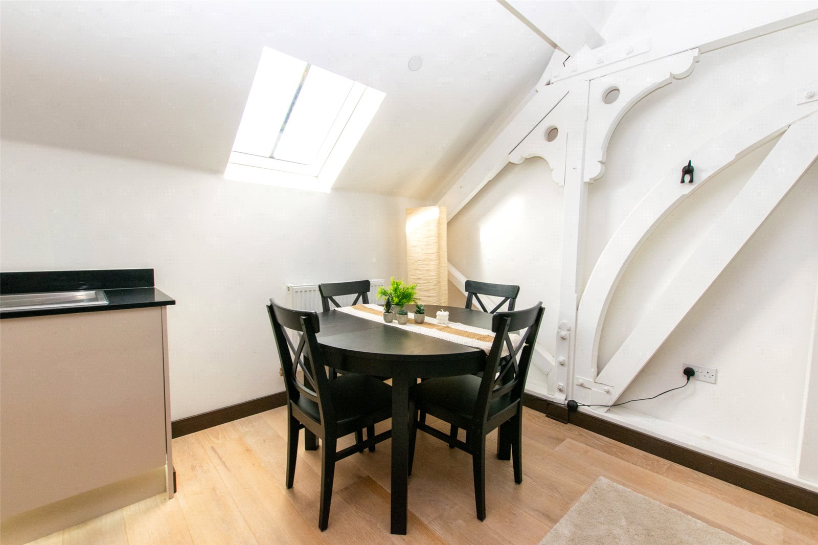 The block itself benefits from a secure entry system with stairs leading to all floors and light coming through stained glass windows. The apartment has an L shape living/kitchen area, with the kitchen itself well equipped and is of a sleek and modern design. The original beams are apparent in the living area, with a handy built in storage cupboard here too.