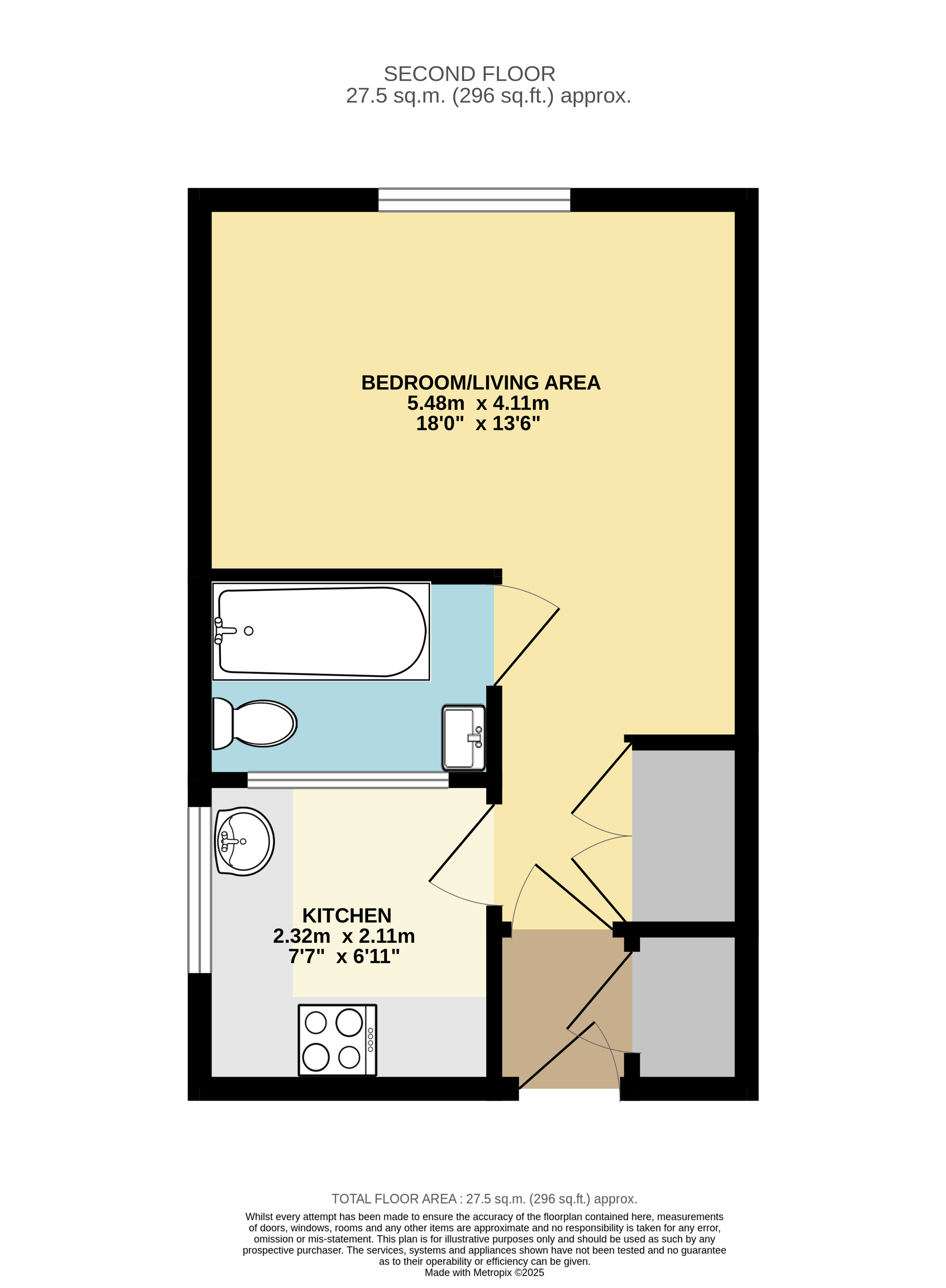 The property is located on the second floor at the end of the block overlooking the trees to the front. An entrance porch brings you into the flat before you then step into the main accommodation. This is a living/bedroom area with doors that then separate the kitchen as well as the bathroom. There are two built in storage cupboards as well as large windows bringing in plenty of natural light.