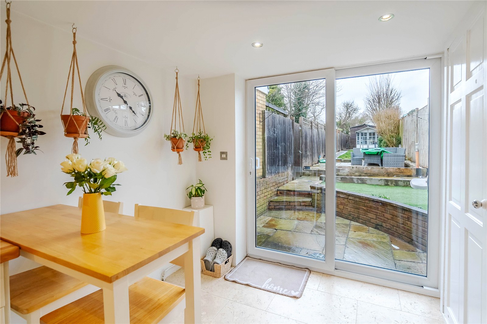 The rear garden is a great size and consists of a couple of different patio areas. A pathway leads up to the back where there is rear access as well as a door to the oversized garage. This comfortably fits a car in and benefits from power, light and an electric door.