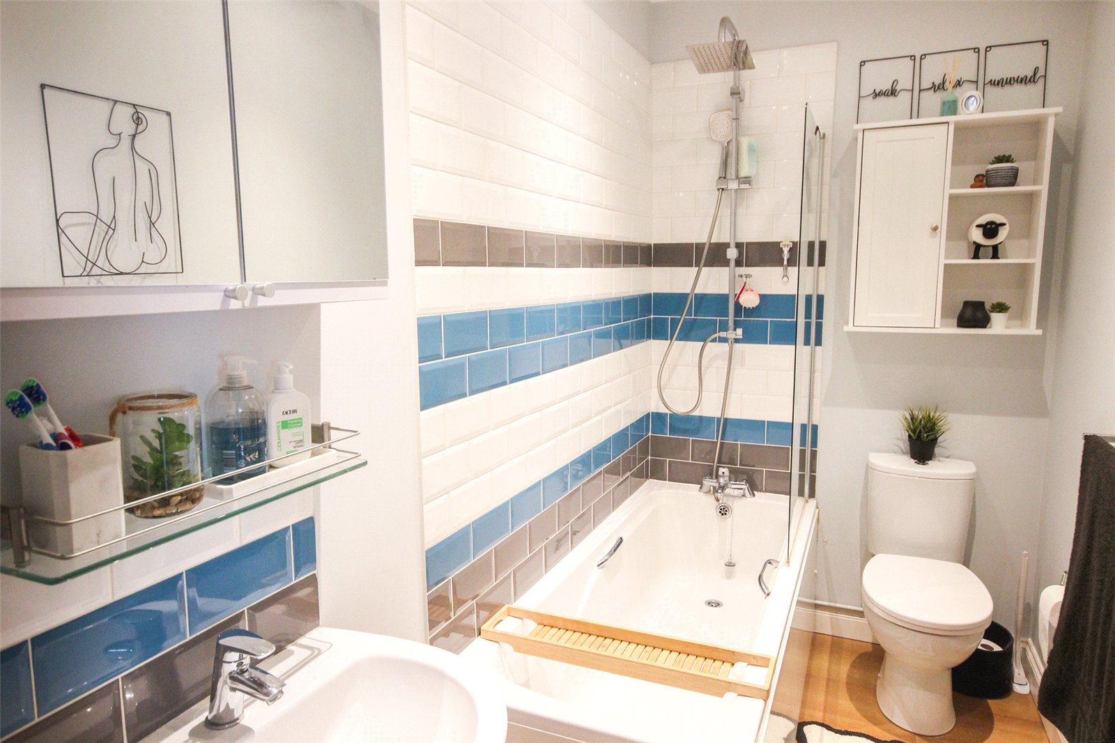 - Stylish bathroom fitted with a panelled bath with shower over, glass screen, wc and wash hand basin