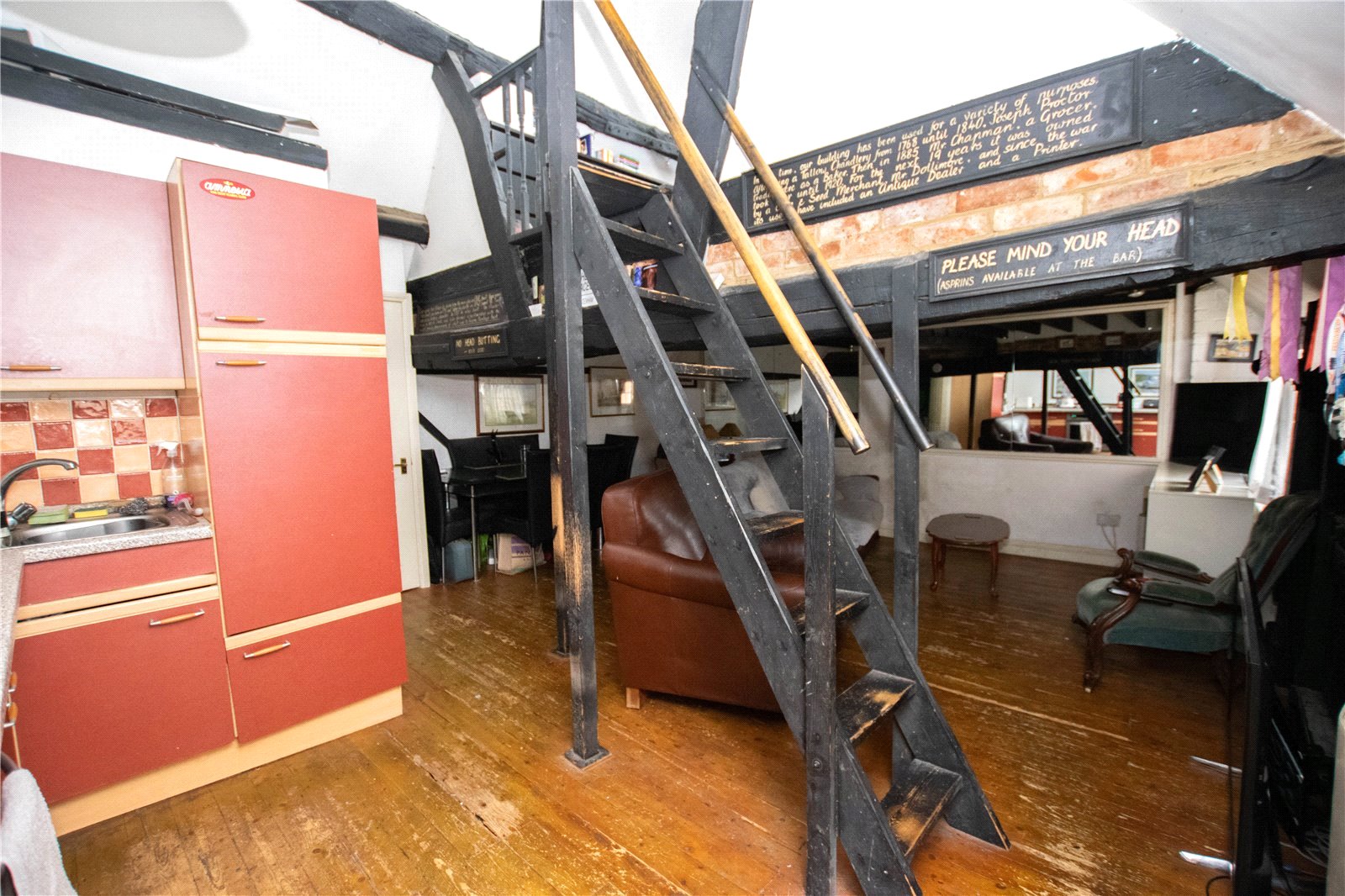 The first floor is the main living space which is an open plan area leading to the kitchen. Beams stretch up the walls and through the ceiling which are original features, along with a drop down hatch to outside to allow further natural light to come in. In addition to the shower room downstairs, there is also a bathroom on the first floor.