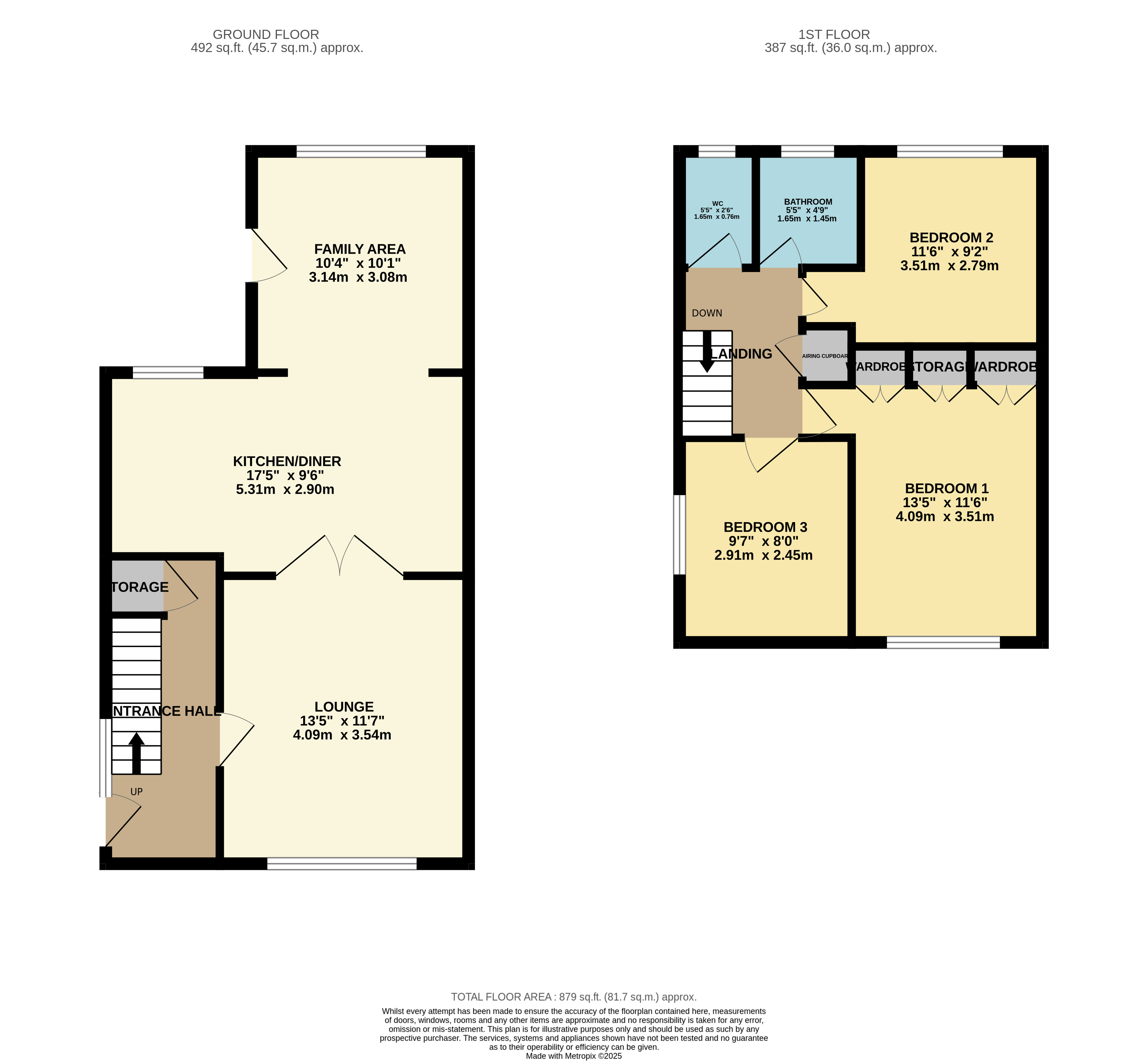 The first floor consists of a landing with airing cupboard and loft access, main double bedroom with built-in wardrobes, second double bedroom, a larger-than-average third bedroom, bathroom, and separate WC.