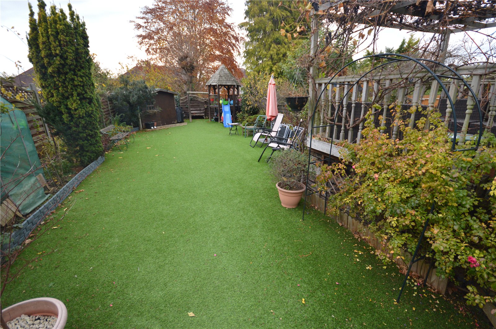 To the front, a slate-chipped garden and driveway provide parking for two to three cars, leading to a single-width garage with power, lighting, and plumbing for a washing machine and tumble dryer. The rear garden is fully enclosed and low-maintenance, featuring a partly enclosed raised decking area and a wooden storage shed — perfect for outdoor entertaining.