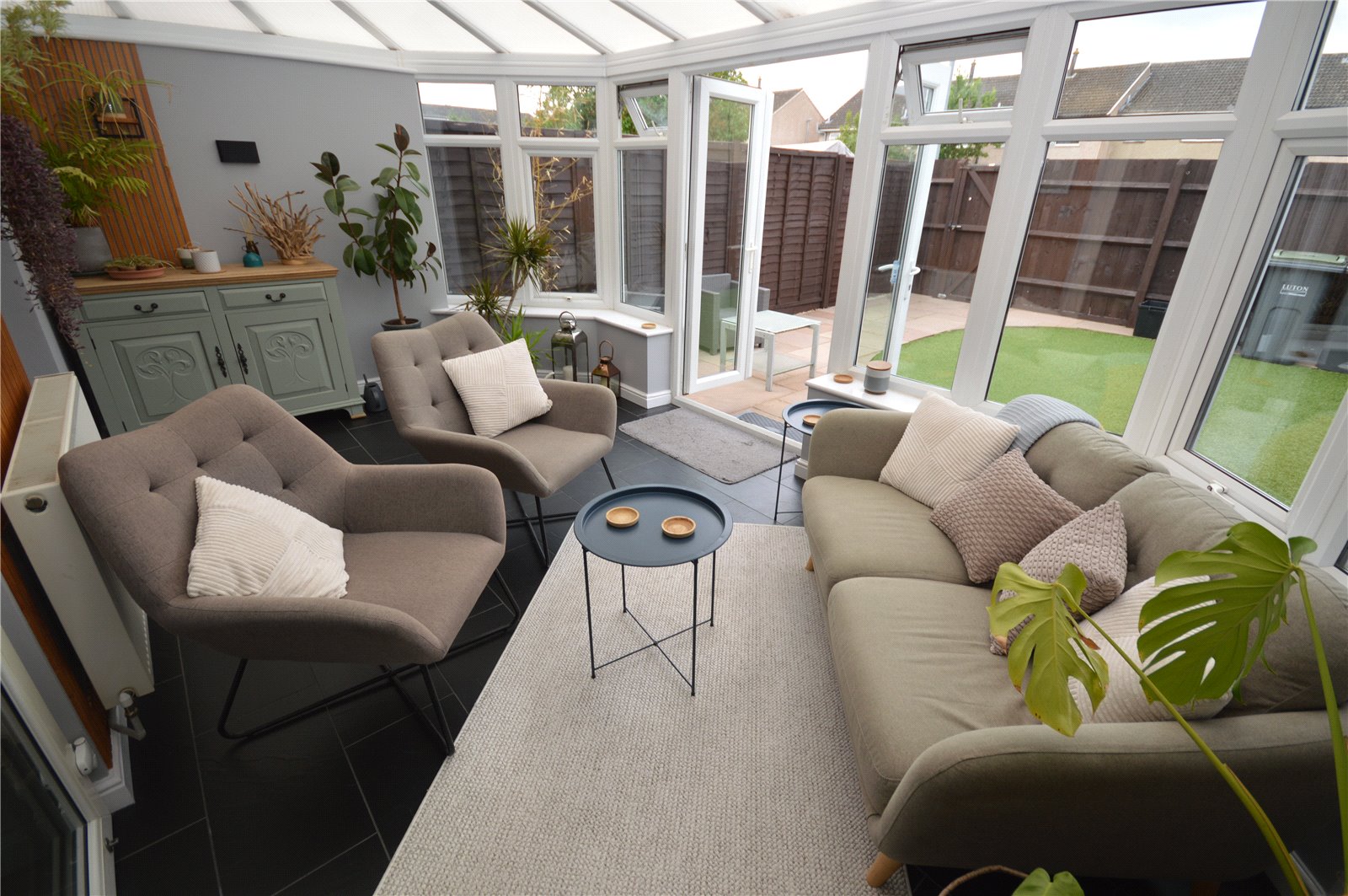 Features include; Entrance porch, large storage cupboard, entrance hall with stairs to first floor and storage cupboard under, cloakroom, refitted kitchen with space for range oven, appliances and has a concealed wall mounted combination boiler, spacious lounge with French doors to rear, full width conservatory with access to rear garden.