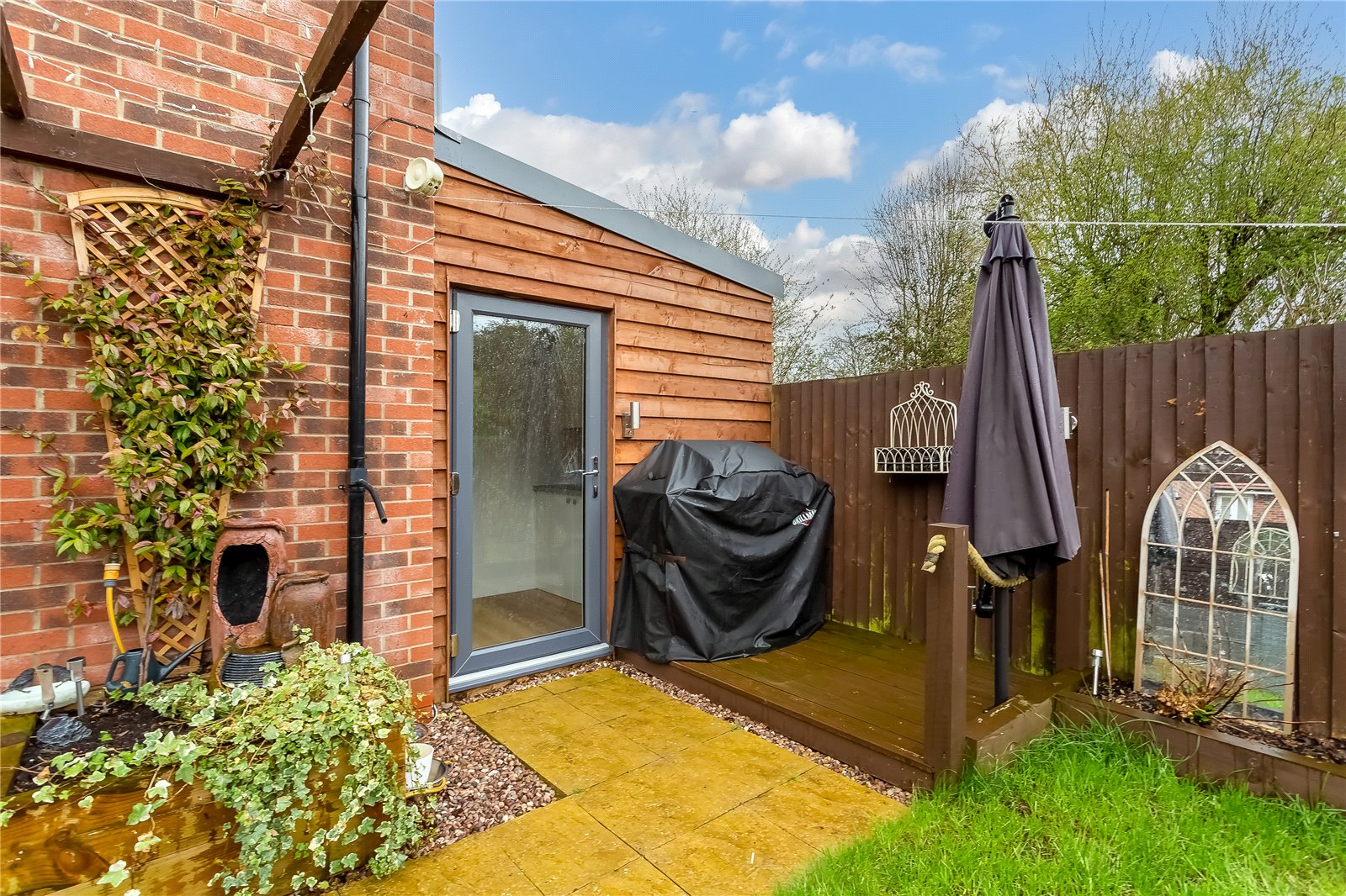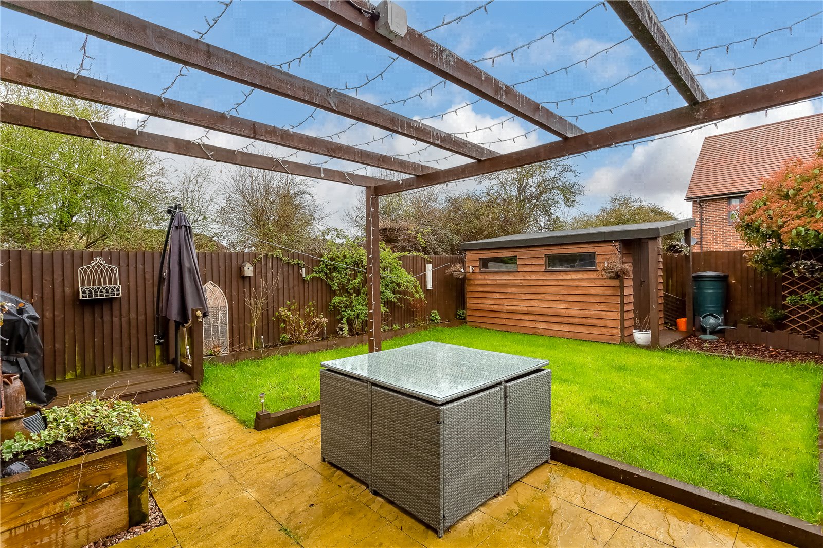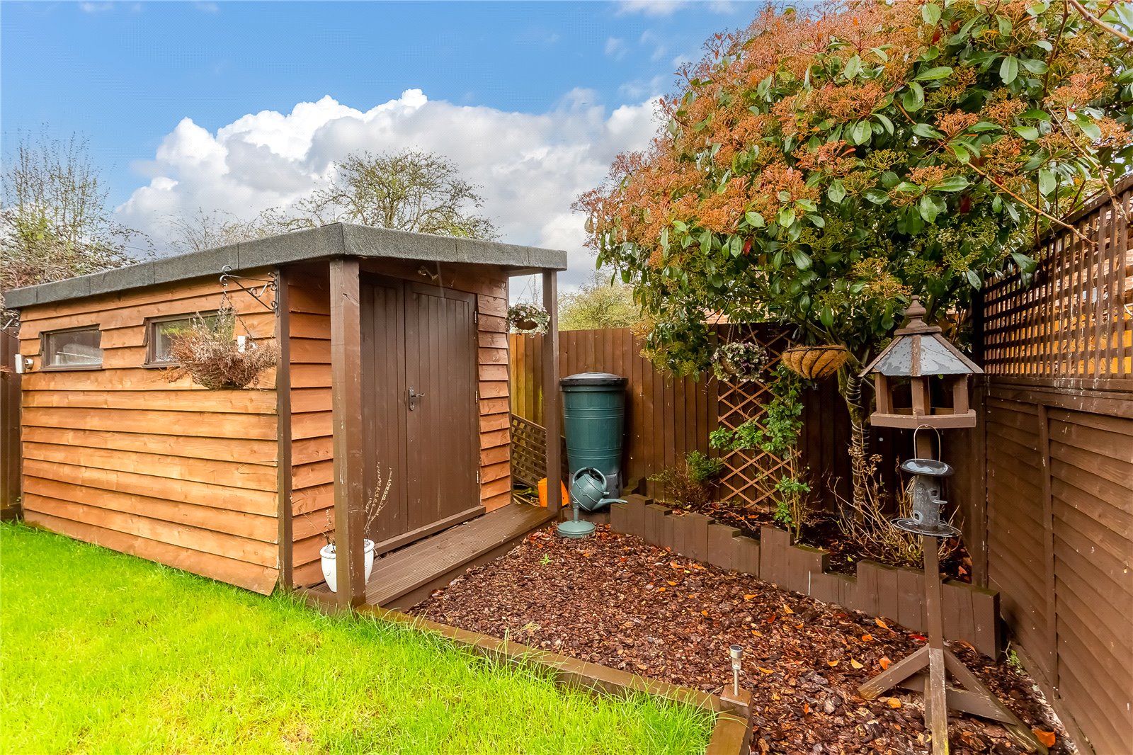- Landscaped garden with detached cabin/storage