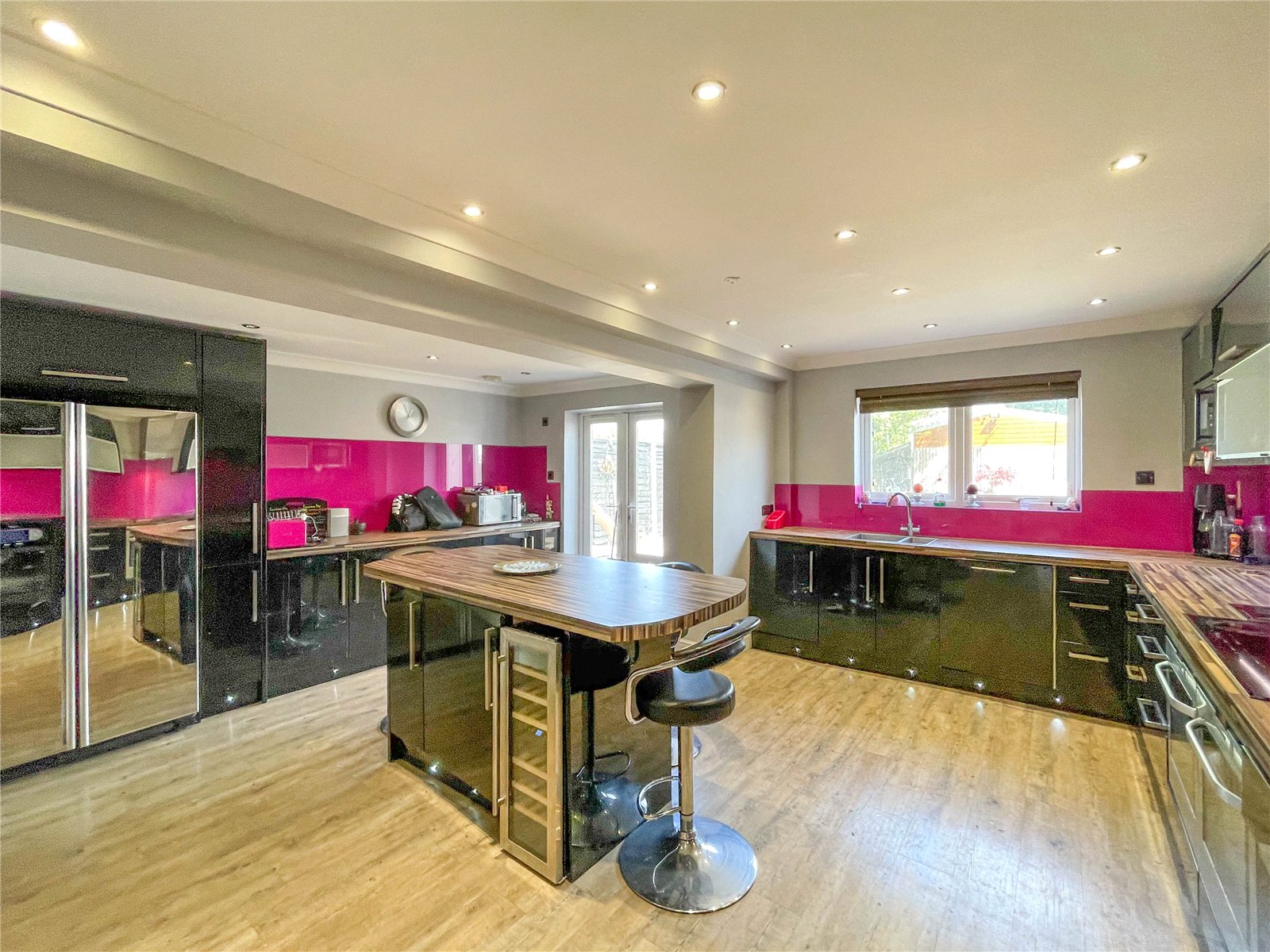 A staircase from the hallway leads down to a converted cellar, currently used as a games room with a dedicated bar area and an additional cloakroom—perfect for entertaining.