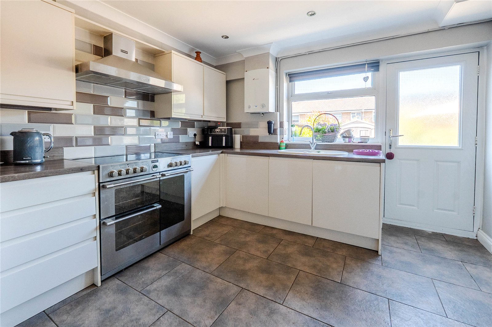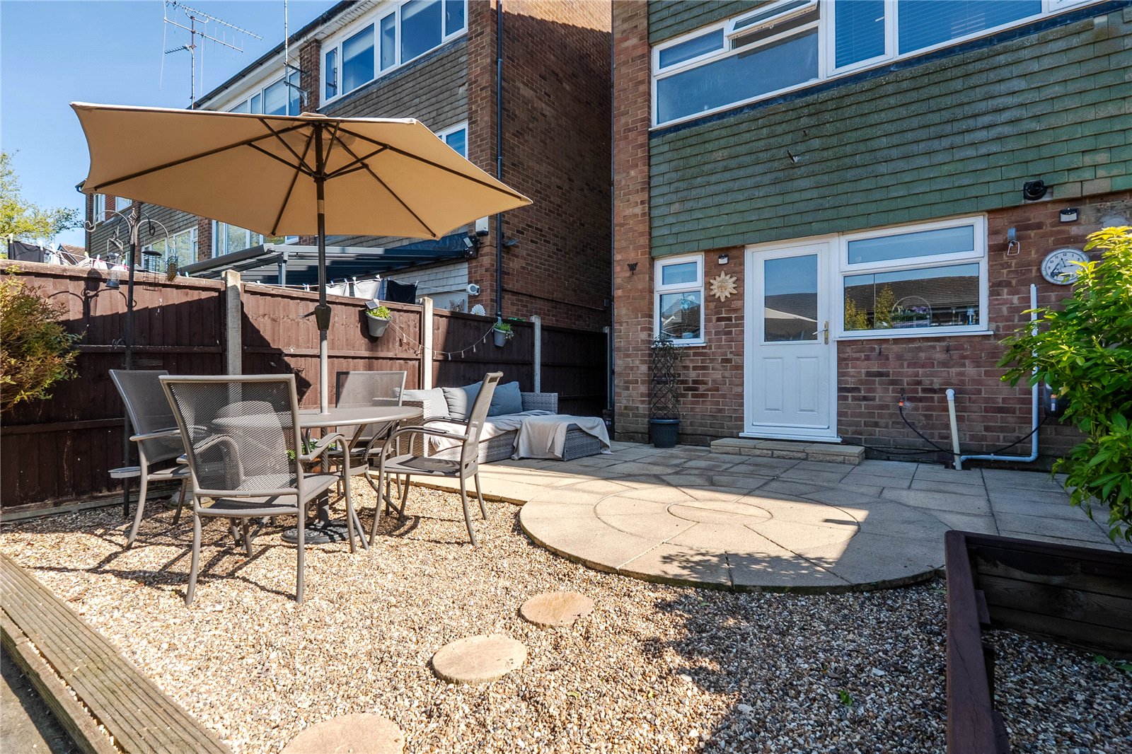 Upon entering the property, you're greeted by an entrance hall featuring a practical cloakroom. The spacious, refitted kitchen and dining area provide a modern space for family meals and entertaining. The back door then opens onto a beautifully landscaped, private rear garden with gated side access to the front of the property.