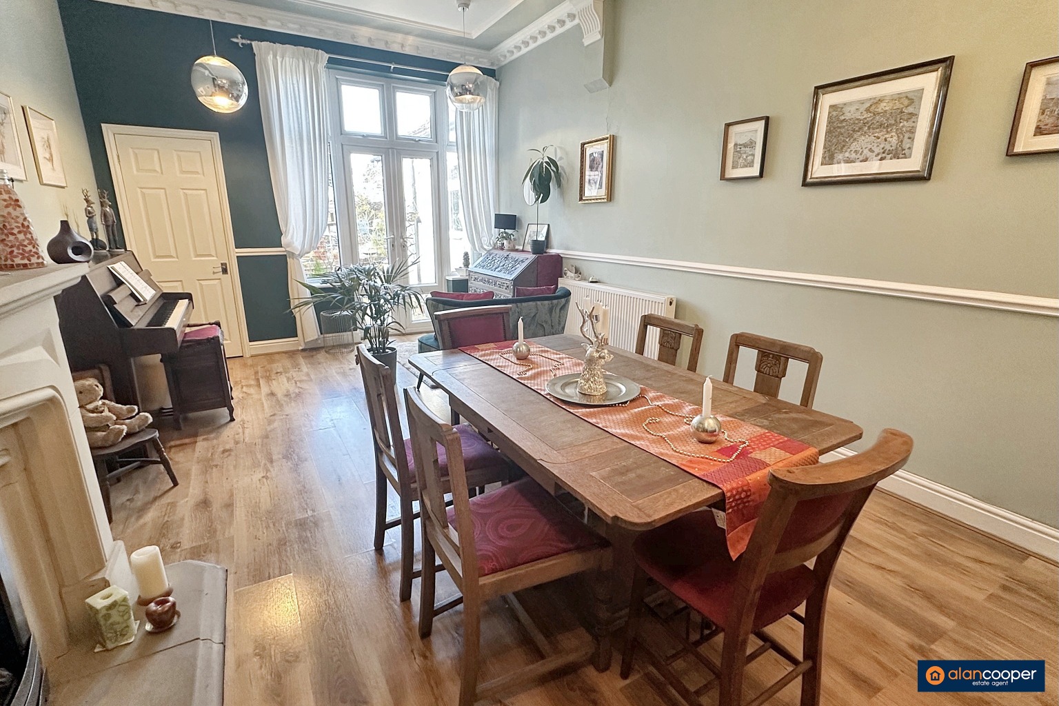 The second reception room is impressively spacious, serving as a combined living and dining area. This versatile space also showcases a statement fireplace and benefits from glazed double doors that lead out to the enchanting garden, seamlessly blending the indoor and outdoor living experience.