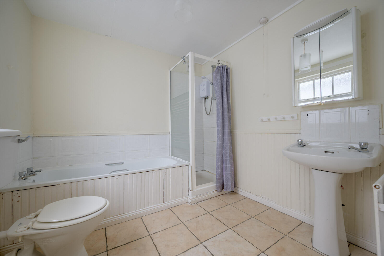 Bathroom: - With white suite comprising panelled bath, chrome taps, tiled splashback, separate shower cubicle with electric shower, pedestal wash hand basin, low flush WC, tiled floors.