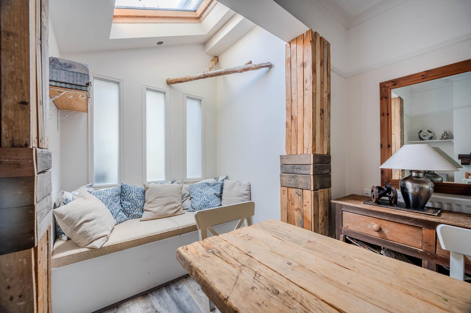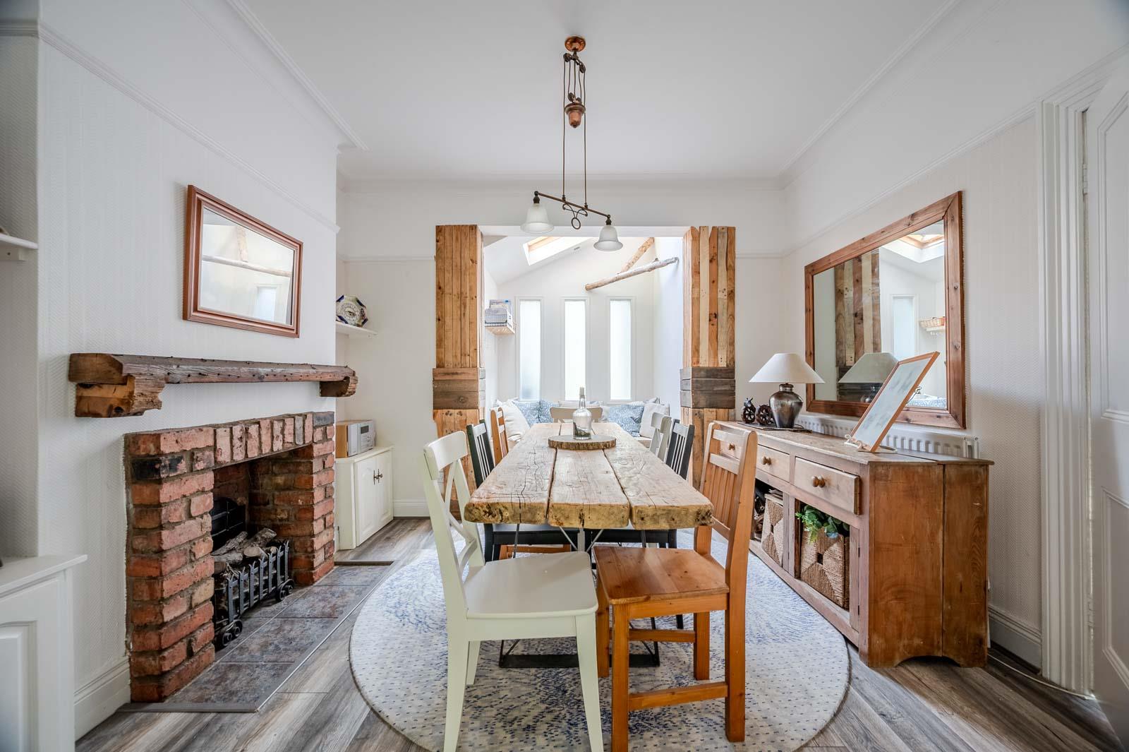 Dining Room: - 4.75m x 3.73m (15'7" x 12'3") - Brick fireplace, wooden mantel, built-in shelving and storage cupboards, cornice ceiling, picture rail, velux window, built in seating area with feature frosted glass windows.