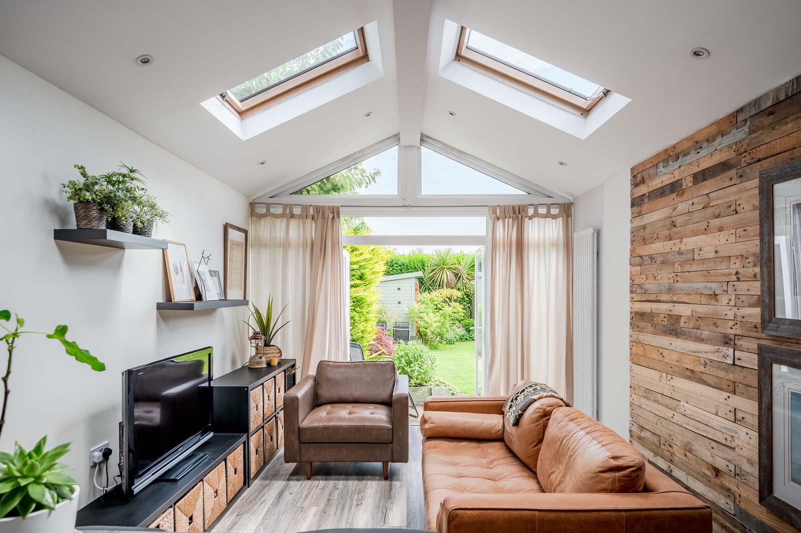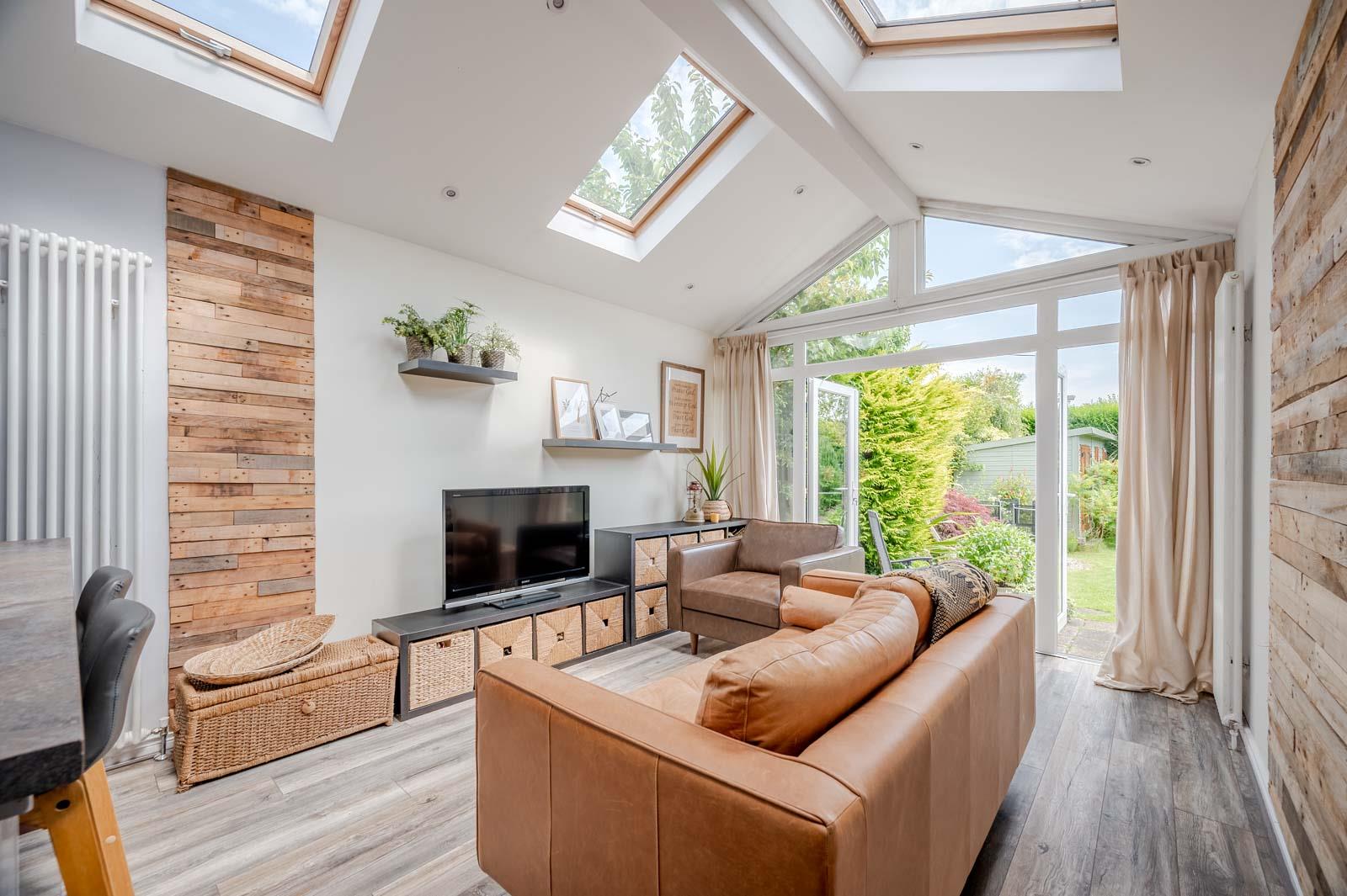 Living / Dining: - 7.87m x 4.72m (25'10" x 15'6") - Measurements at widest points. Feature vaulted ceiling with velux windows, feature panelling to walls, column radiator, informal dining area, office space with velux window, recessed spotlights, Pvc double glazed French doors to rear