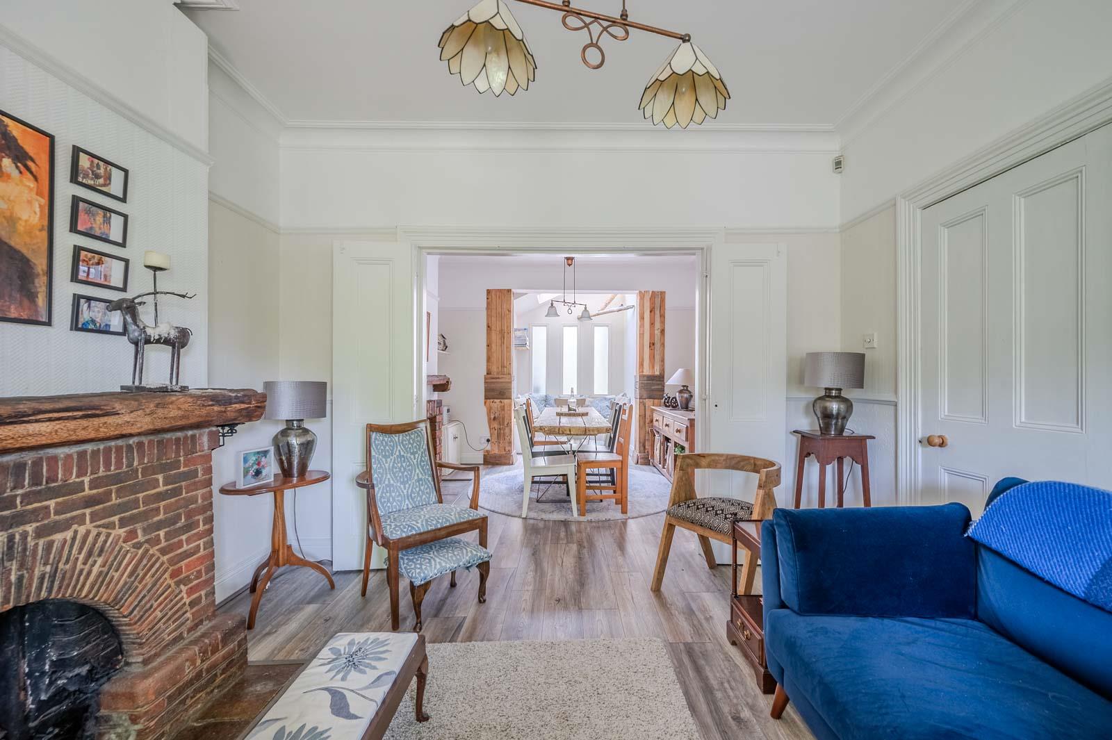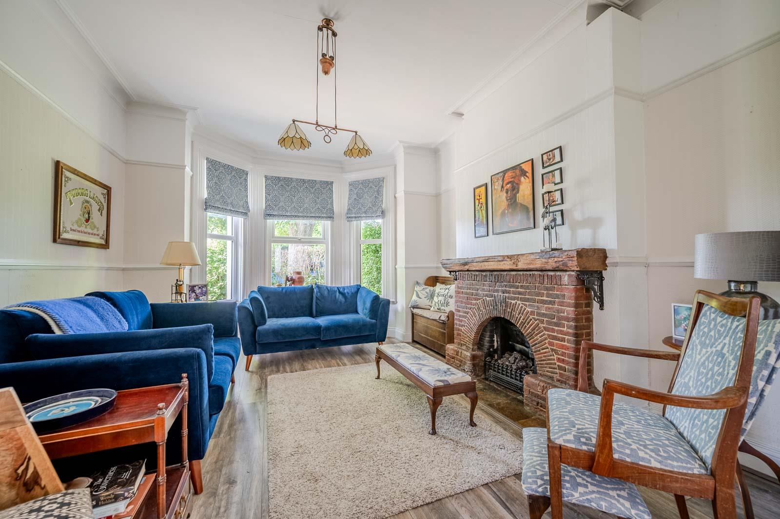 Lounge: - 4.34m x 3.73m (14'3" x 12'3") - Measurements into bay window. Brick fireplace, wooden mantel, gas coal fire, cornice ceiling, picture rail, bi-folding doors through to dining room.