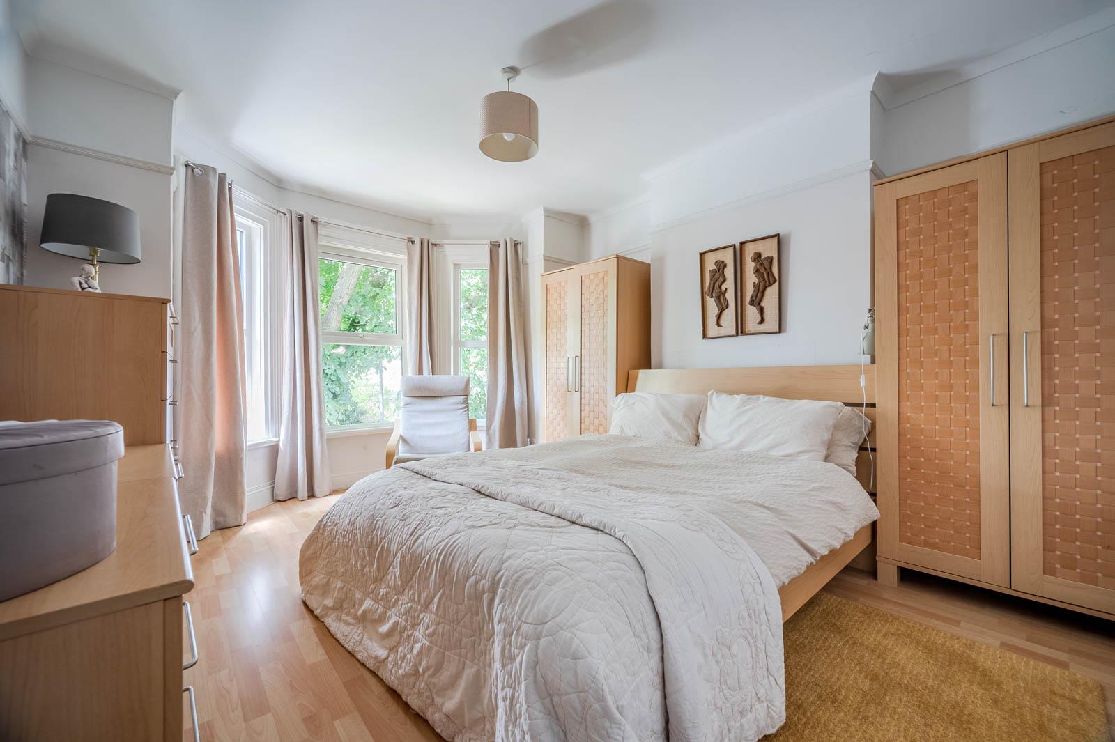 Bedroom One: - 4.34m x 3.73m (14'3" x 12'3") - Measurements into bay window. Cornice ceiling, picture rail, wood laminate flooring, mature outlook to front.