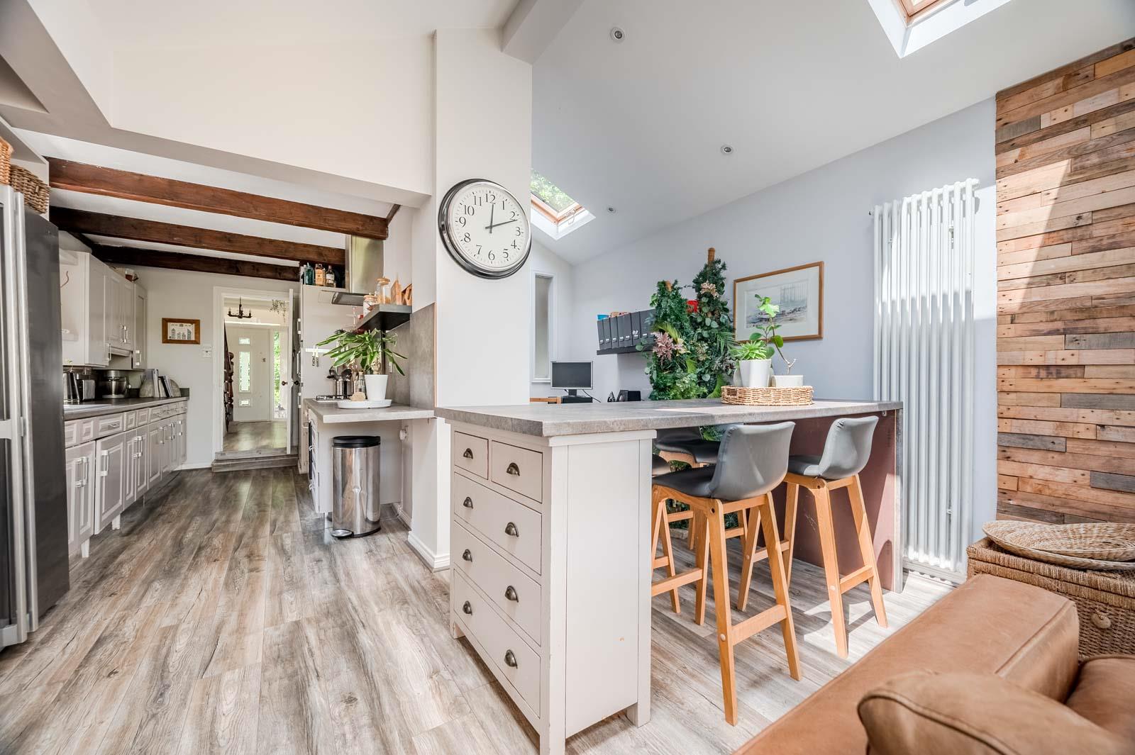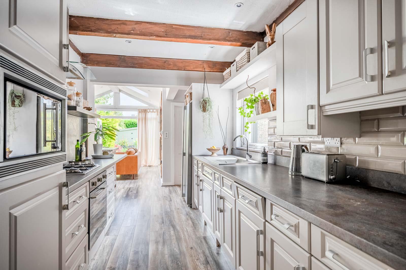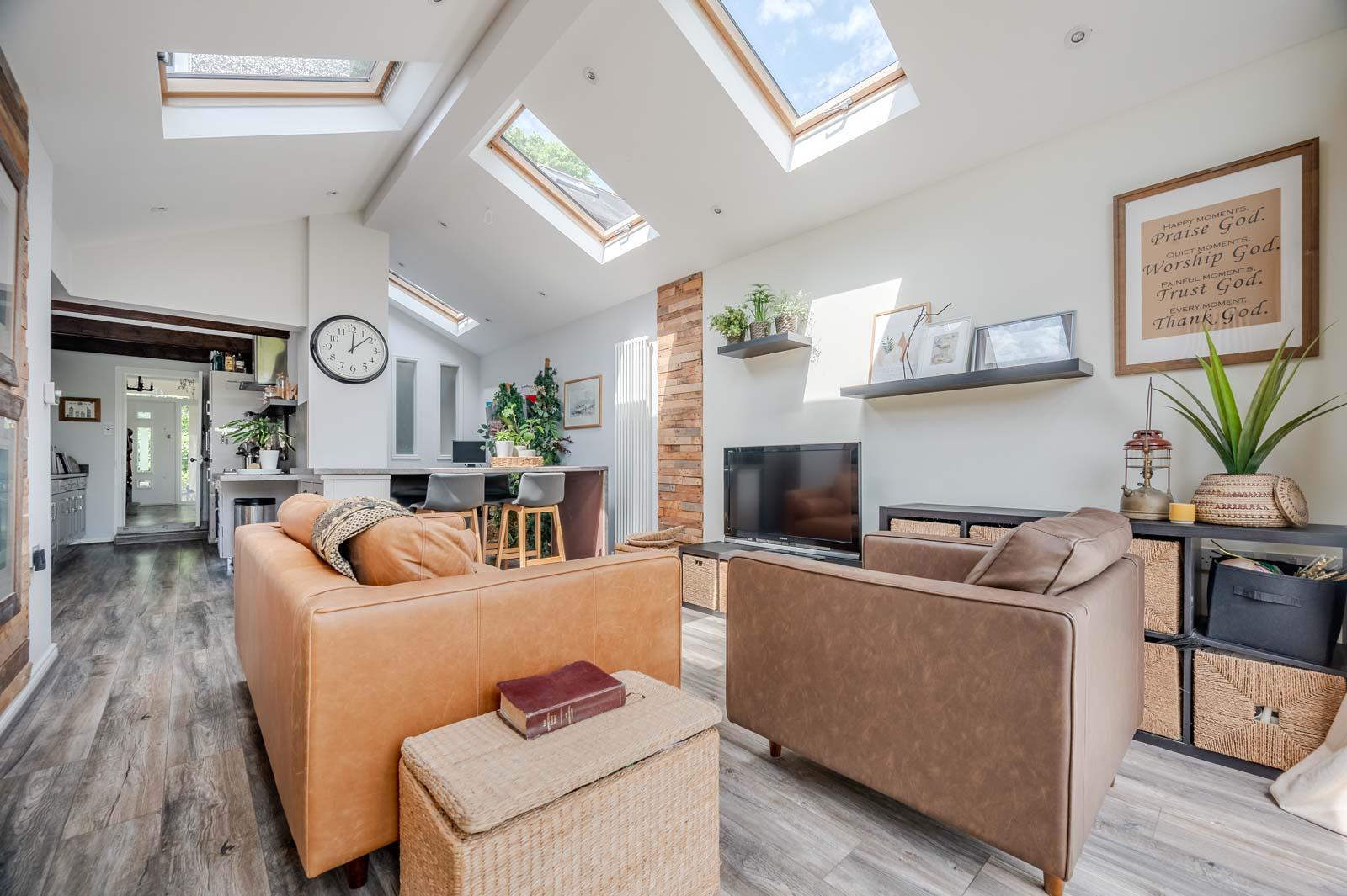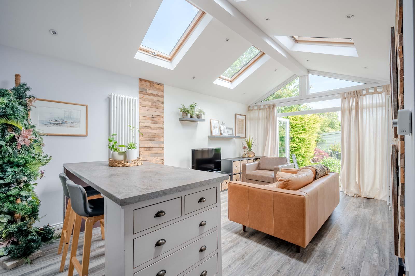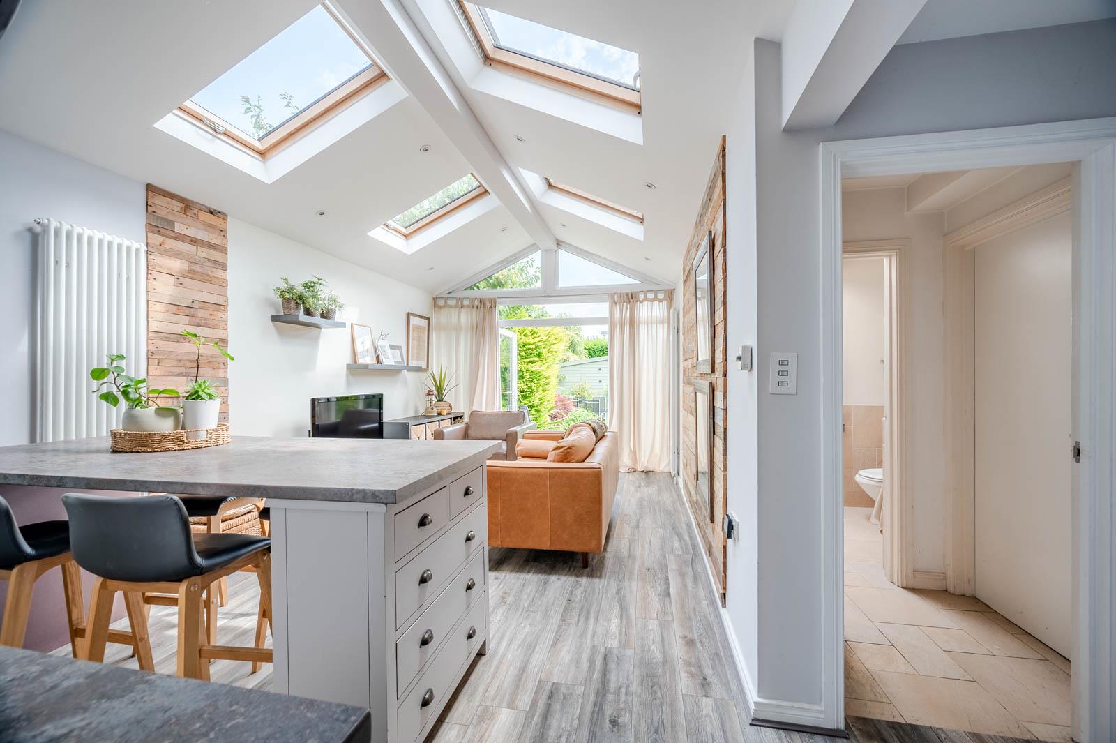 .Modern Fitted Kitchen open to Extended Living / Dining Space and Office Area with Feature Vaulted Ceiling