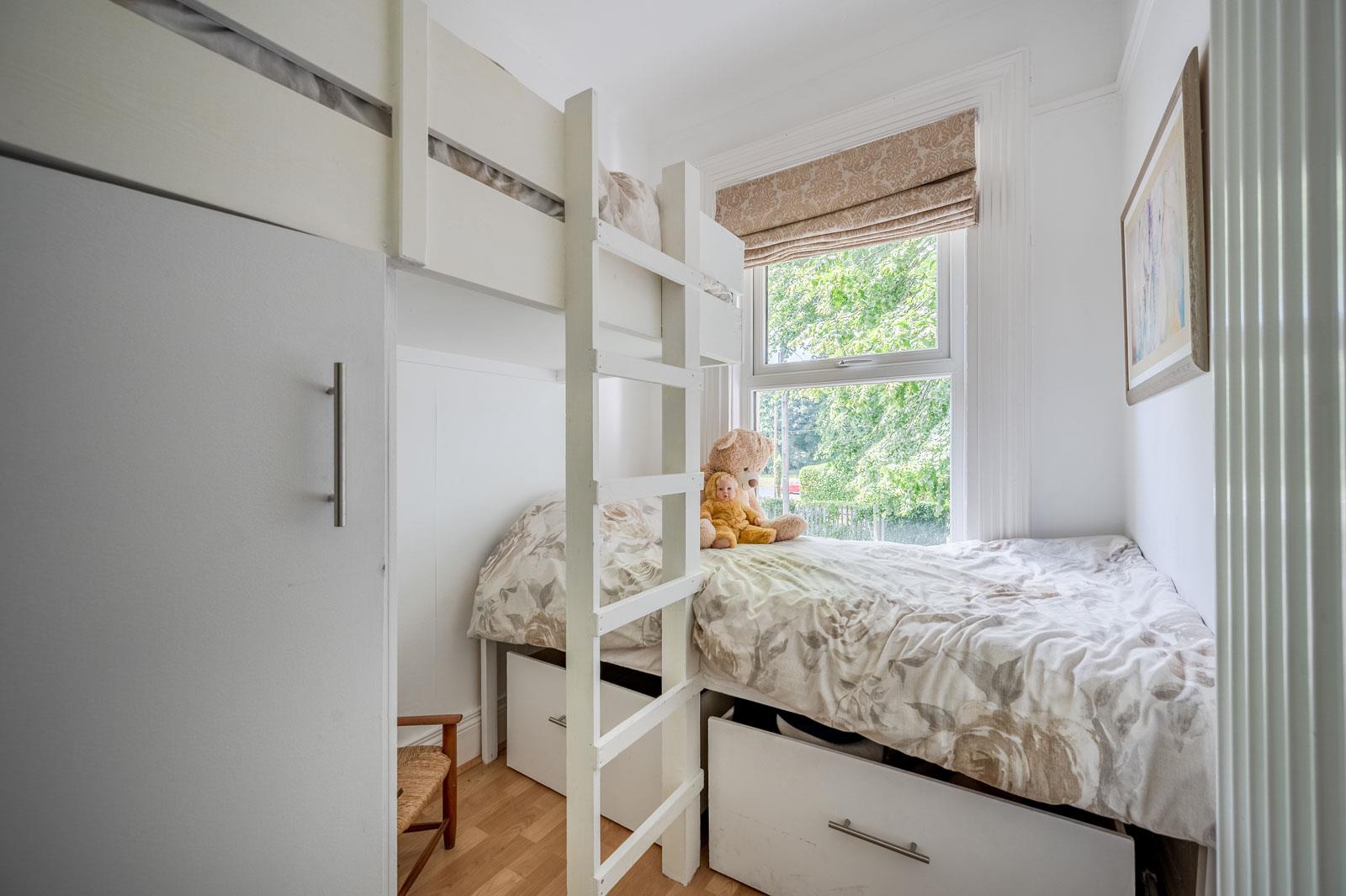 Bedroom Three: - 2.26m x 1.83m (7'5" x 6'0") - Picture rail, mature outlook to front, built in bunk bed with storage.