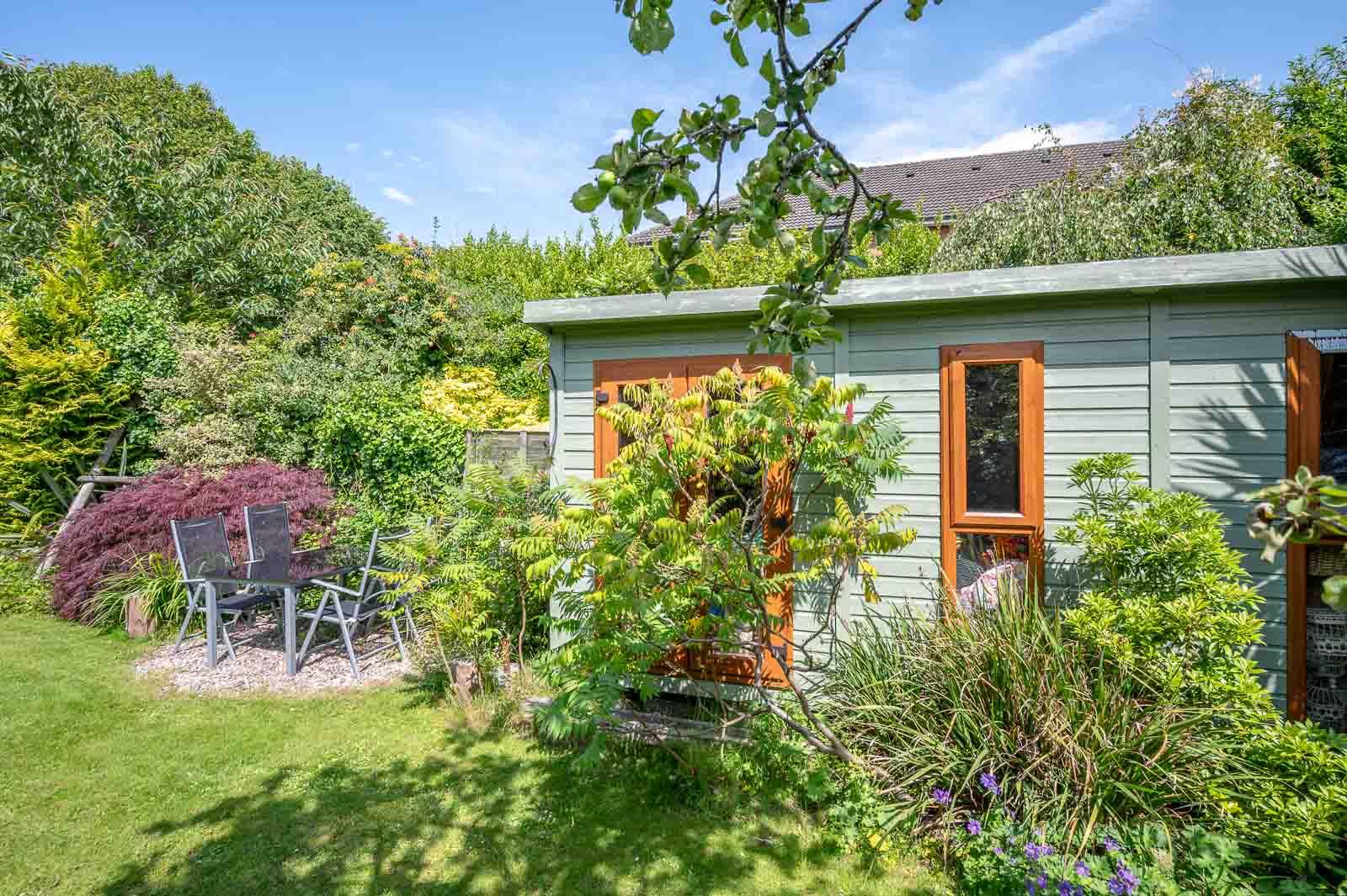 Outside there is a driveway for ample off-street parking, and a beautifully mature and private garden to rear with covered patio area and stoned areas, ideal for outside entertaining. The attached garage has been converted into a studio/office space with kitchenette and additional shower room (currently achieving £650 per month rent including energy bills).