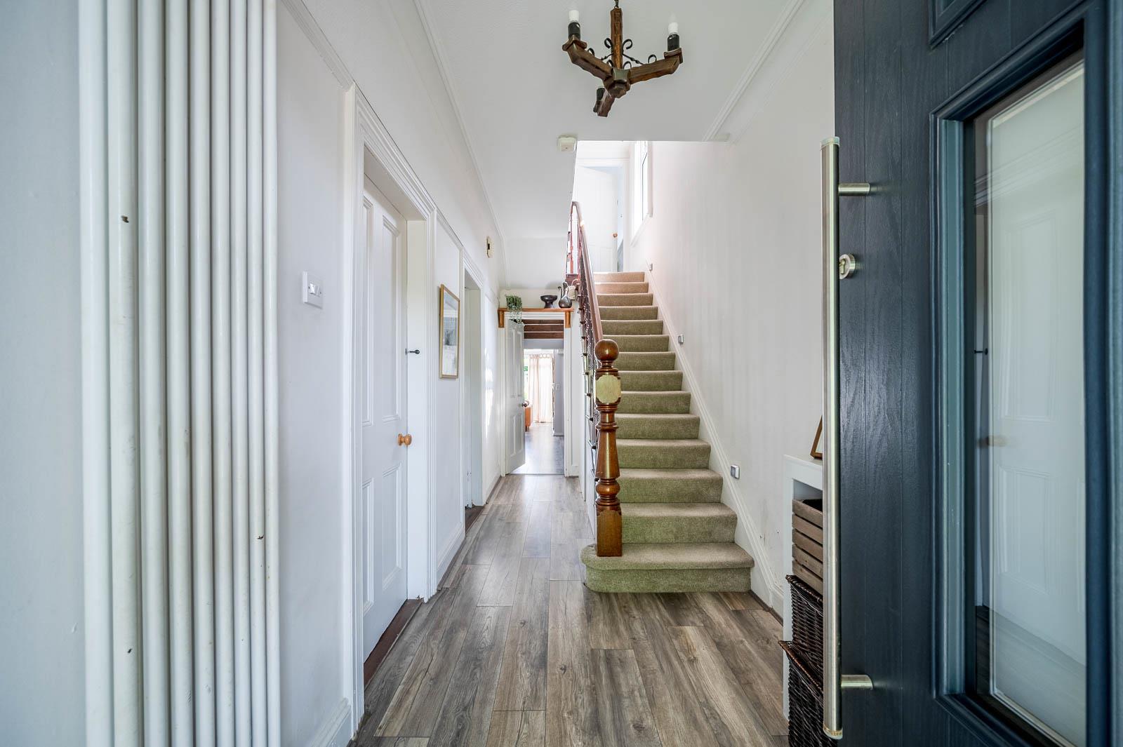 Reception Hall: - Wood laminate flooring, cornice ceiling, cloaks area and storage under stairs.
