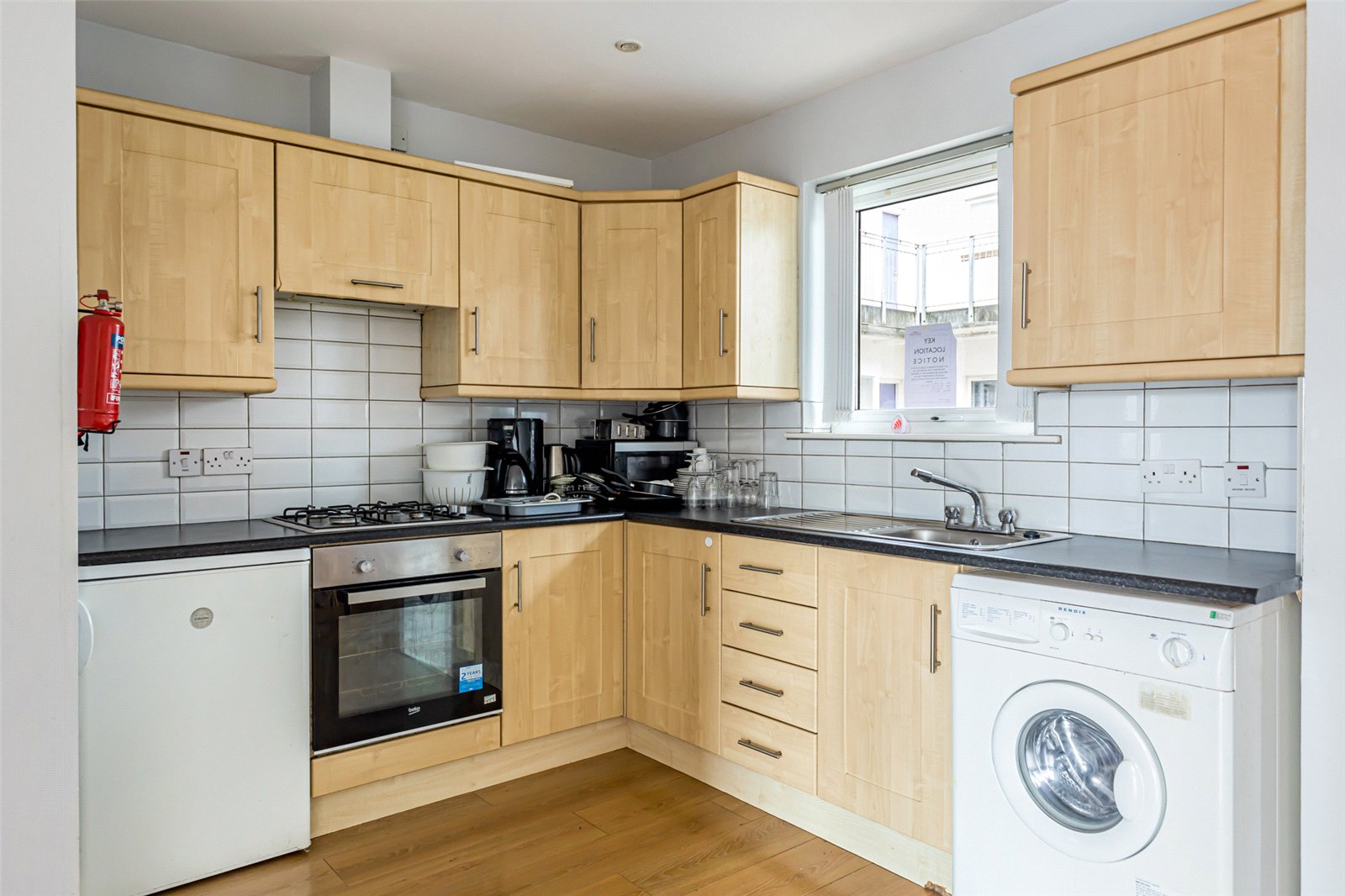 the apartment, which is lift accessed, comprises two bedrooms, open plan kitchen, living and dining room, and a bathroom which has a three piece white suite.