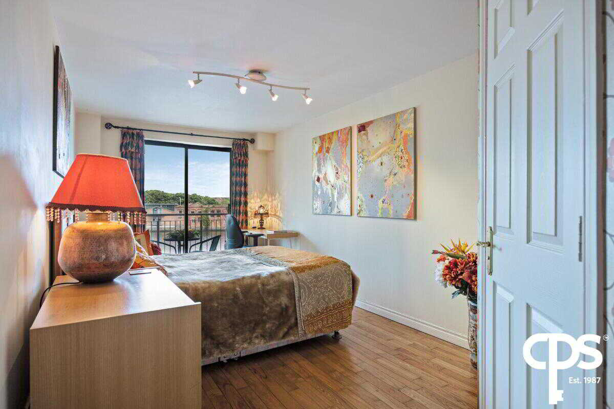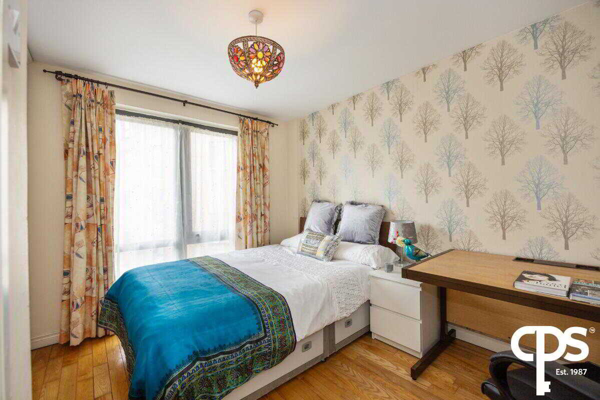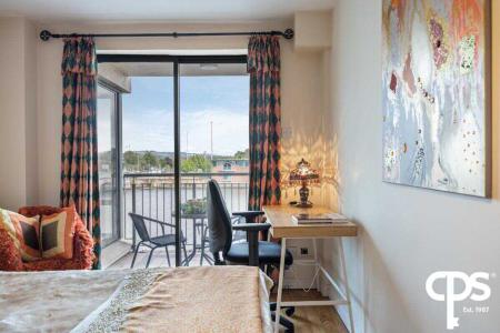 Spacious, bright master bedroom with en-suite bathroom. Wooden floors throughout, and bedroom is flooded with ample amounts of light with large water facing window with sliding door to balcony.