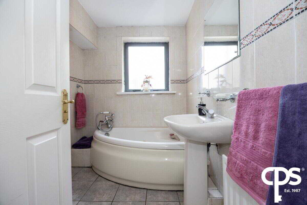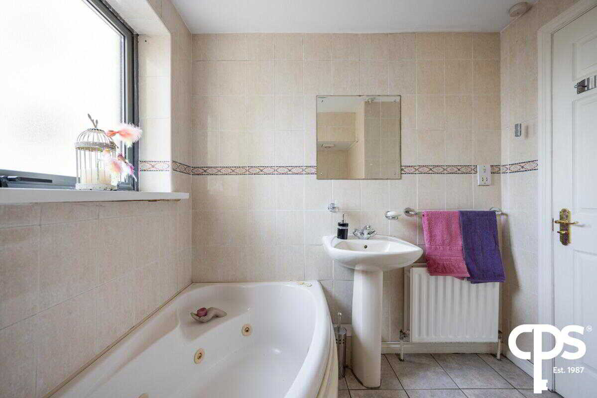 Family bathroom with a three-piece white suite, including a jacuzzi bath, sink and toilet. This bathroom has tiled floors, tiled surround and ample natural light.
