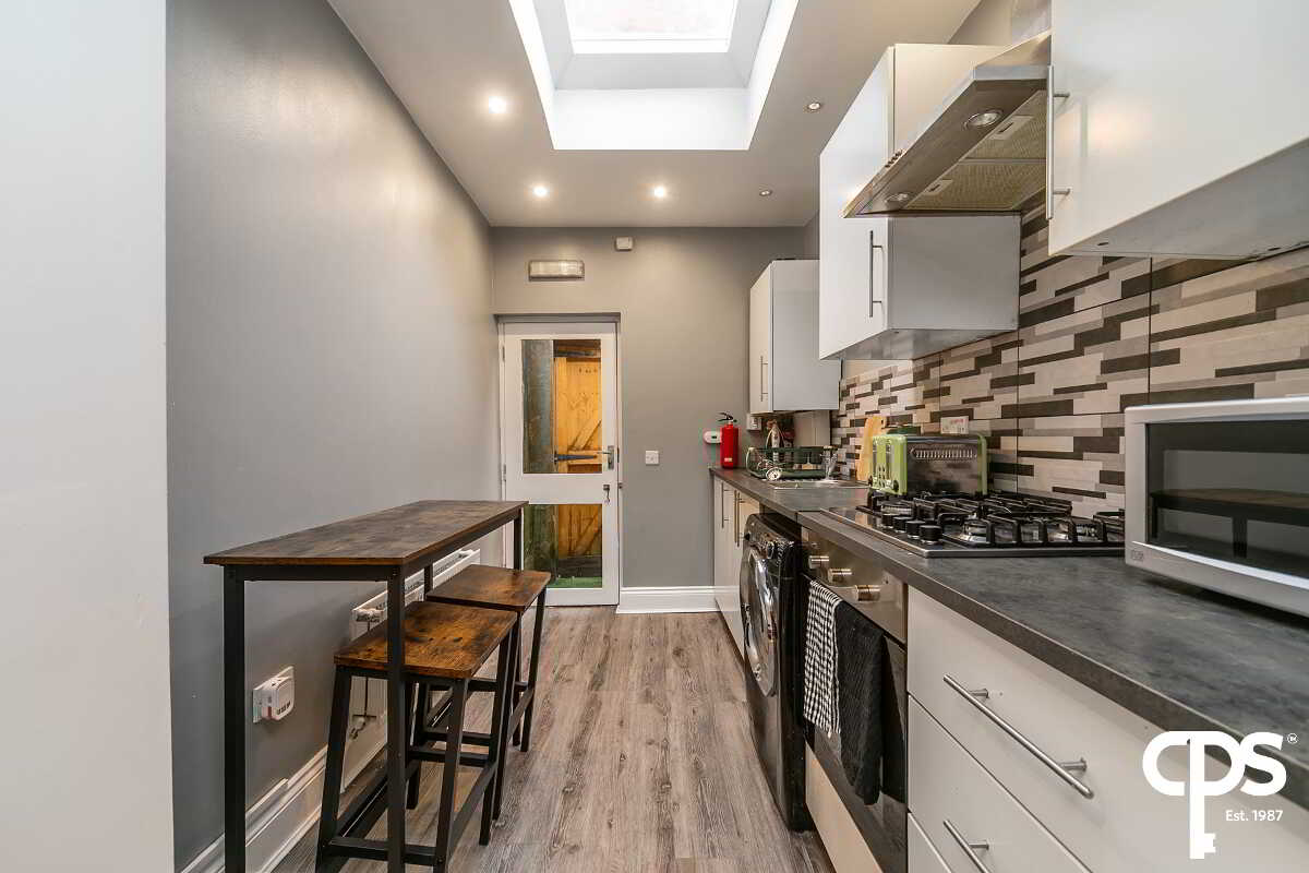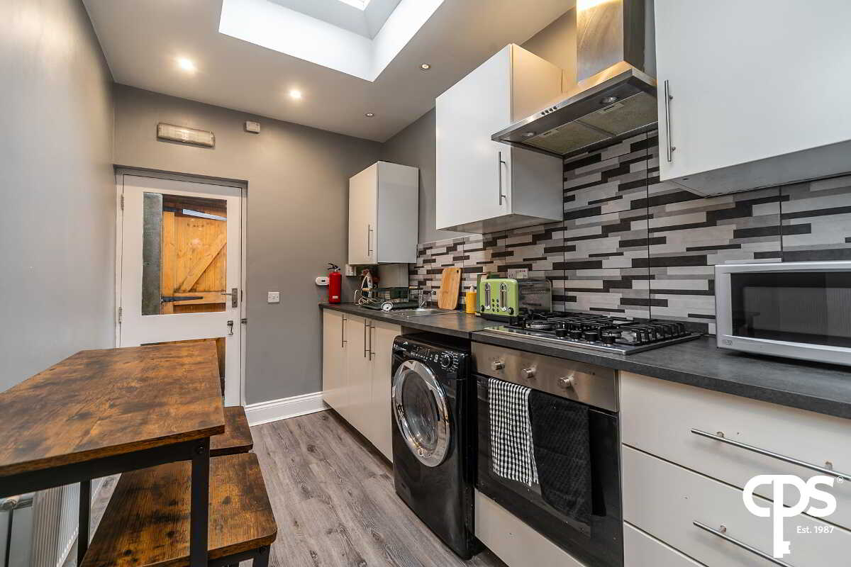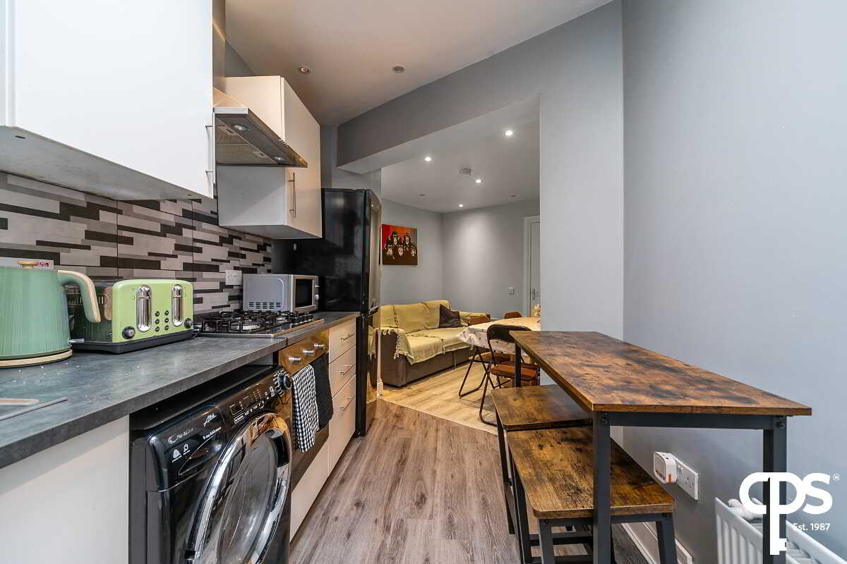 This property features a modern kitchen finished with neutral décor and laminate flooring. The kitchen has a built-in electric oven and gas hob. The kitchen leads through to the dining/living area, also featuring laminate flooring.