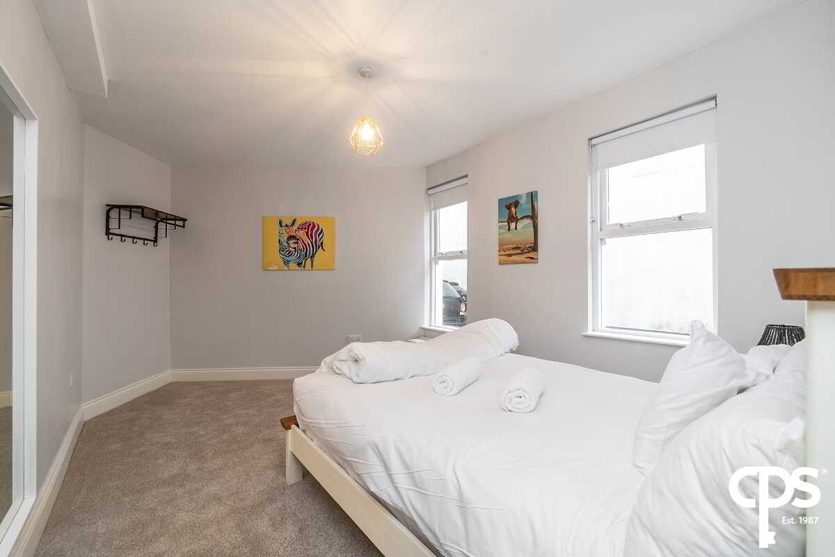 Spacious double bedroom with carpet flooring and neutral décor.