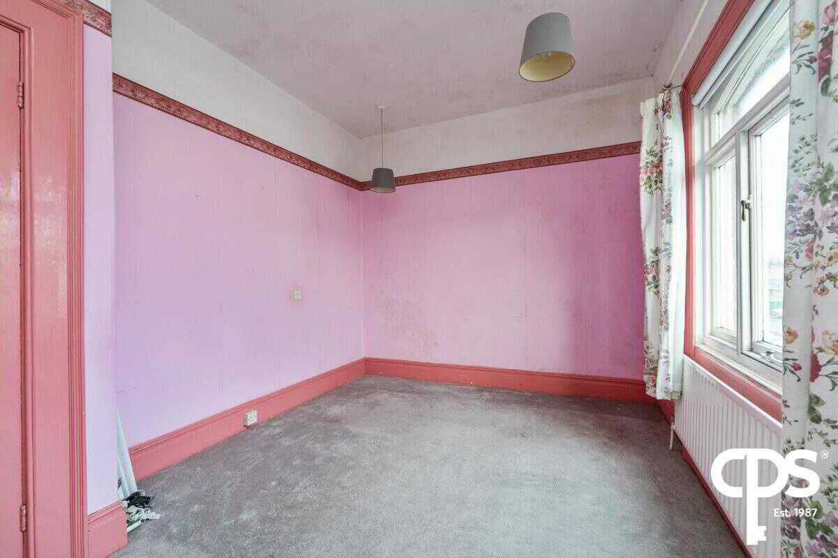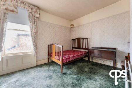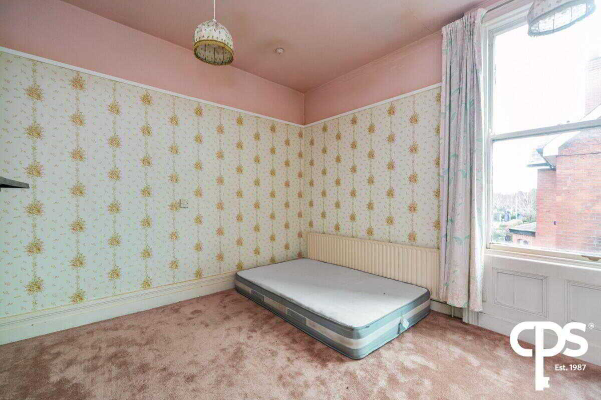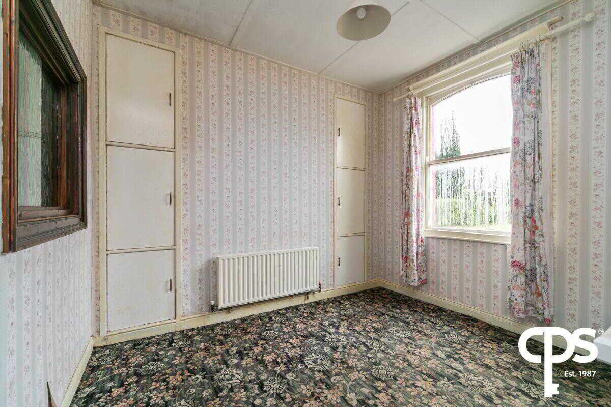 Double bedroom with carpet flooring, along with wallpapered walls, and a window looking out to the rear garden.
