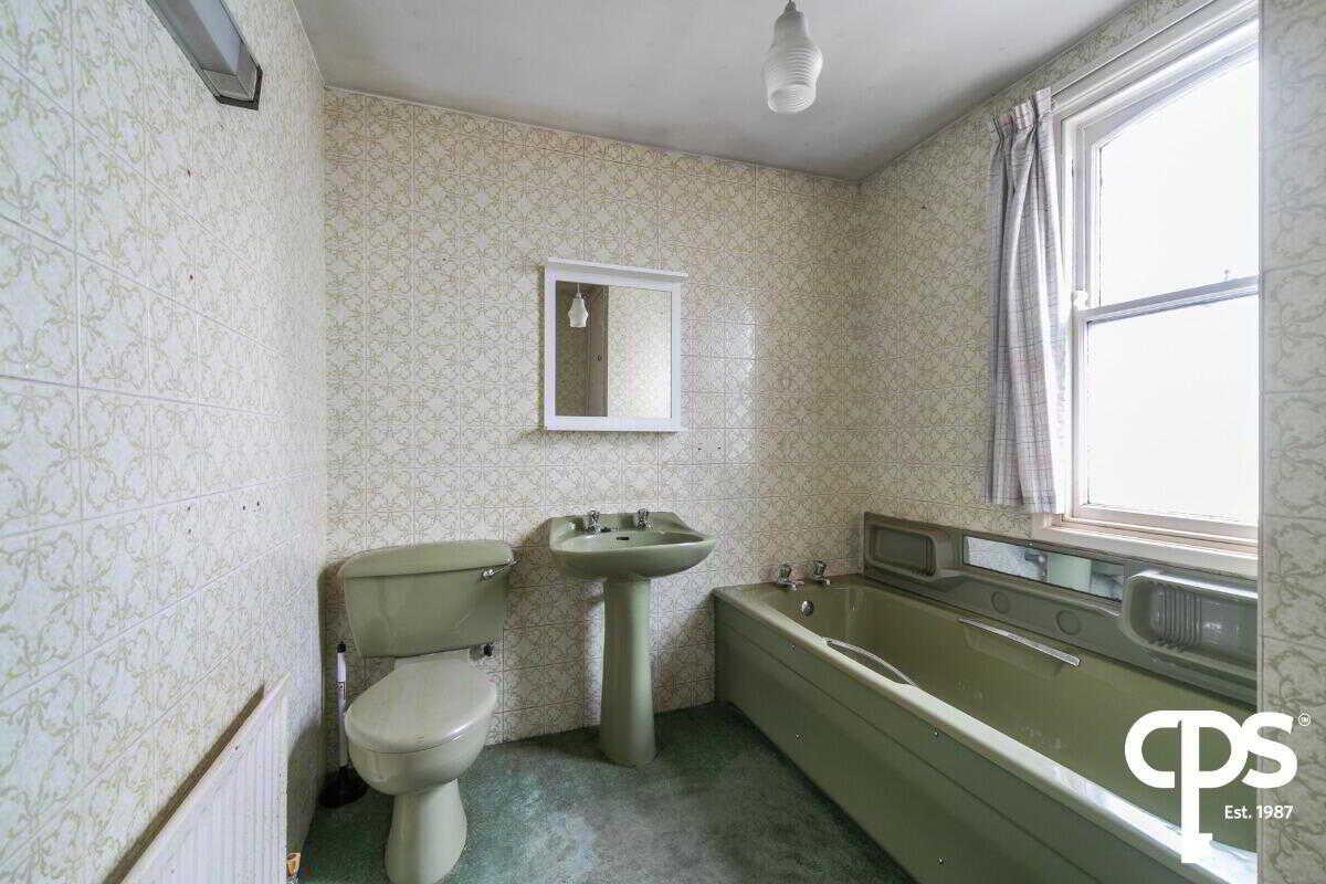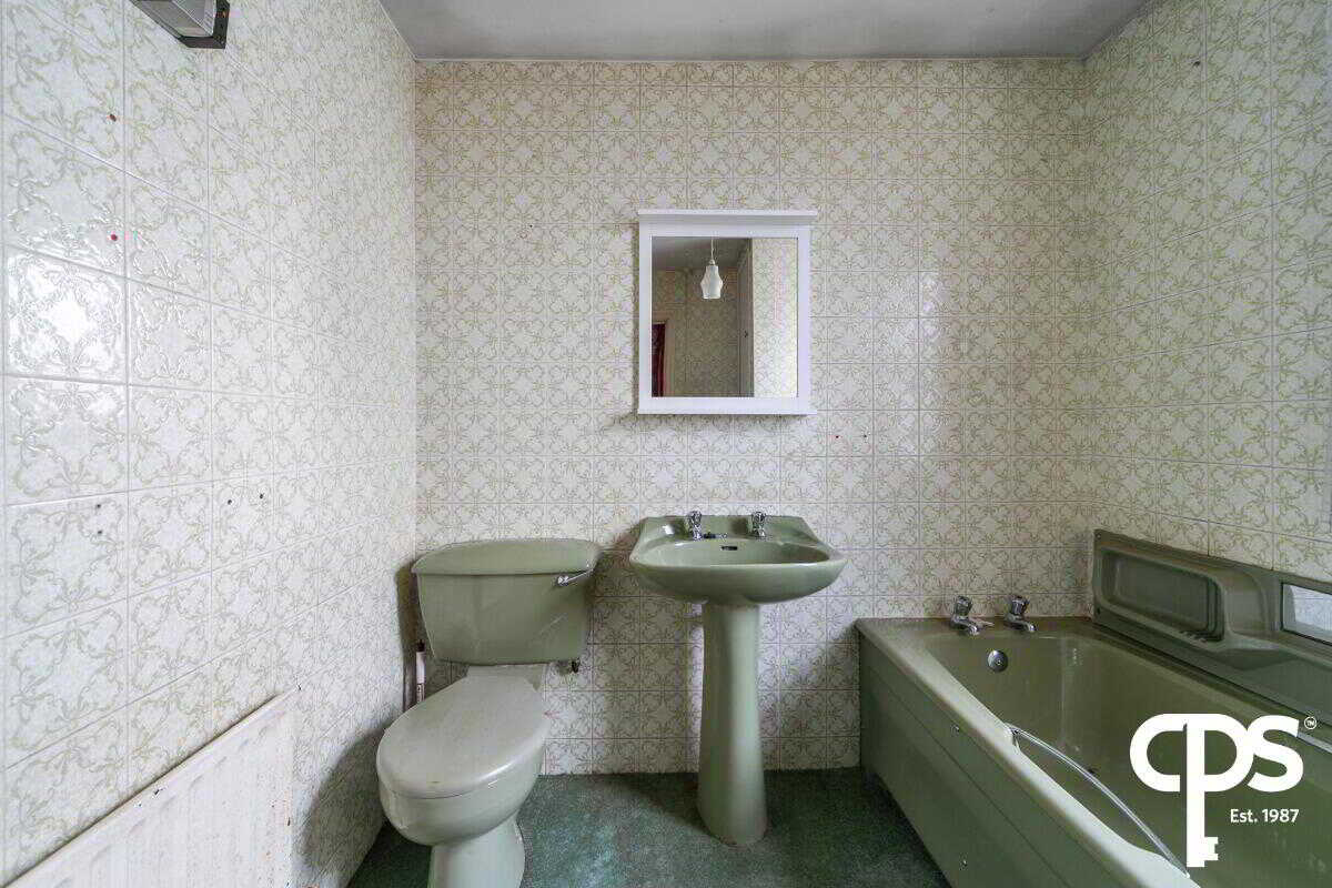Tiled walls and 3-piece suite including a bath, WC and wash hand basin.