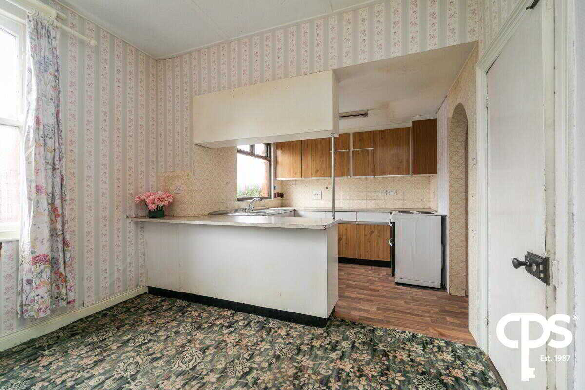 Open plan kitchen / dining area with units high and low, along with access to rear garden, laminated wooden floor, and dining area with carpet flooring.
