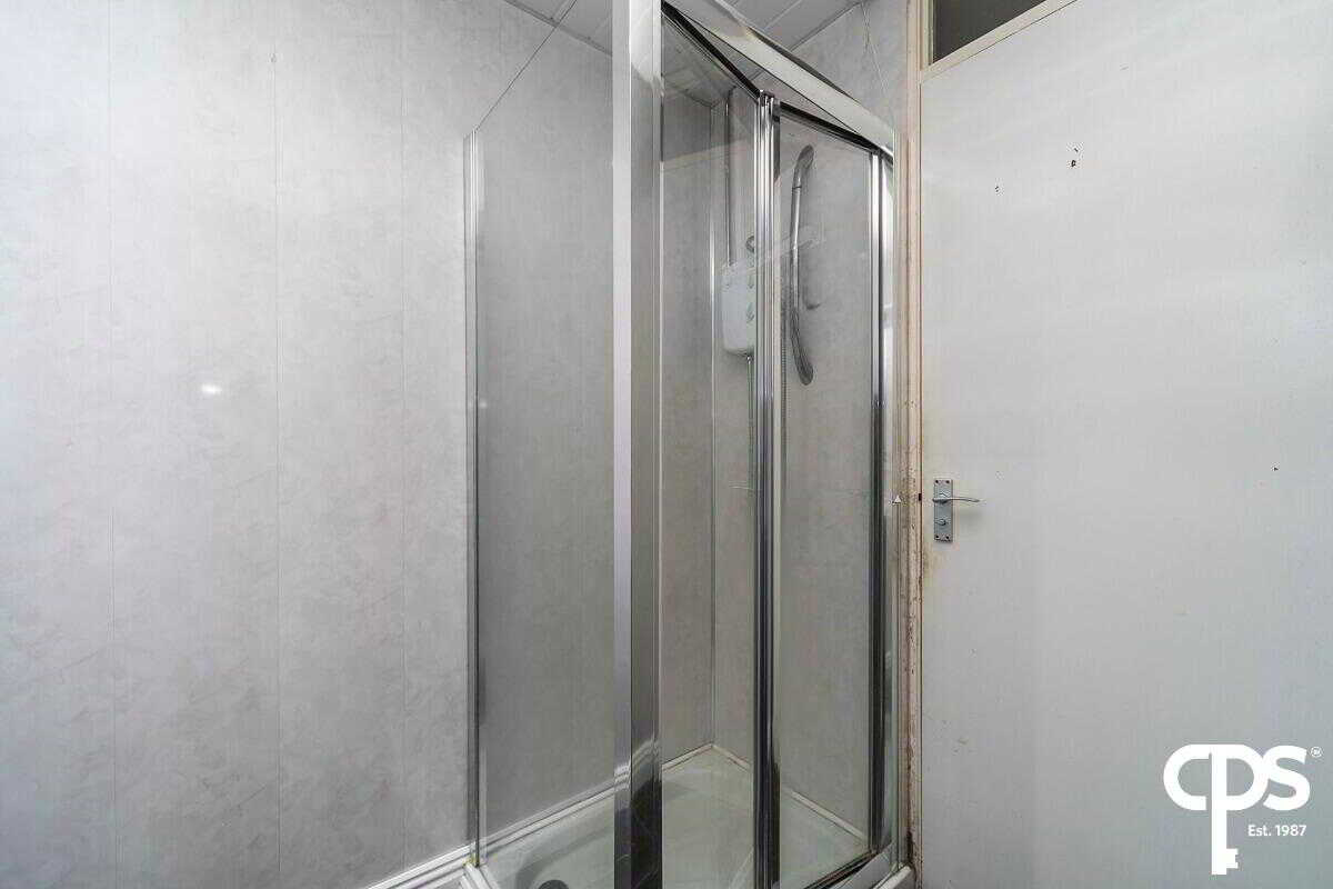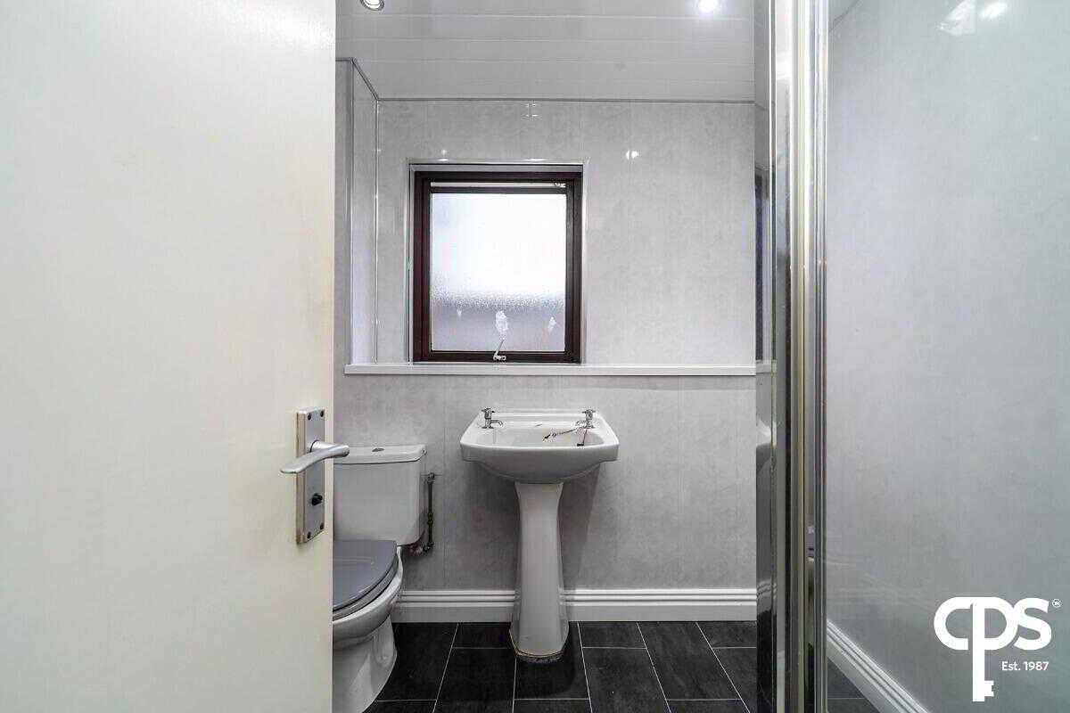 Family bathroom consisting of three-piece white suite including shower, sink and WC. Bathroom is finished with tiled flooring, panelled surround and PVC ceiling.