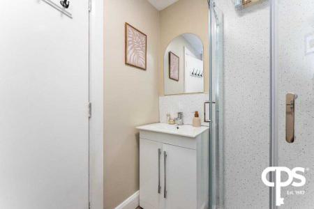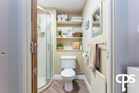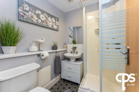 Tile flooring, walls partially tiled, chrome effect corner shower enclosure, electric shower with wand attachment, low flush WC, vanity sink unit with chrome mixer tap, chrome effect towel heater, extractor fan.