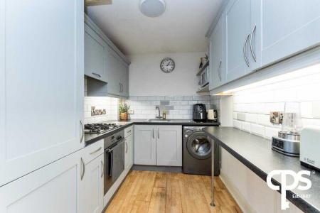 Tile flooring, range of high- and low-level units, stone effect worktops, integrated single oven, four ring ceramic hob, cooker hood, under cabinet LED lighting, brick tile splashback surround, plumbed with undercounter space for a washing machine, double panel radiator, external glass panel PVC door leading to the rear yard.
