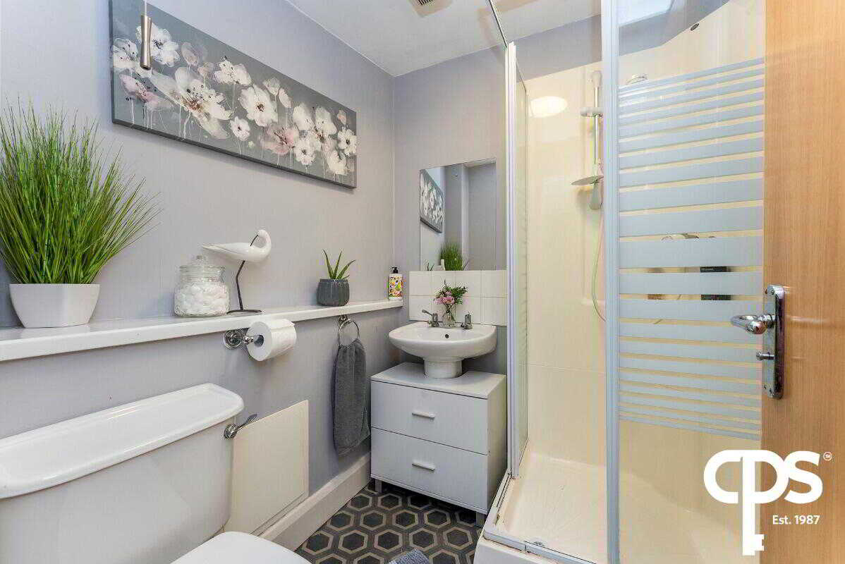 Modern ensuite with three-piece white suite, including corner shower, WC and wash hand basin.
