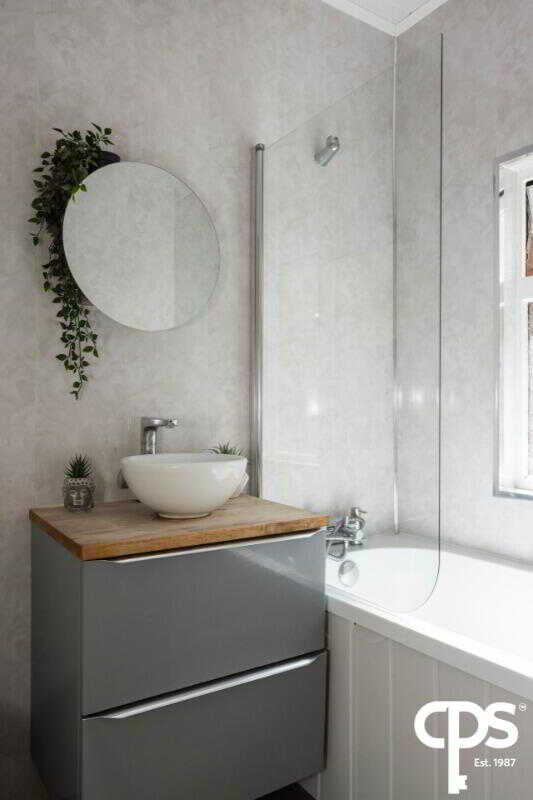 PVC Wall panelling, panelled inset bath with glass shower screen, chrome mixer tap with shower wand attachment, low flush WC, wall hung vanity unit with wash hand basin and chrome mixer tap.