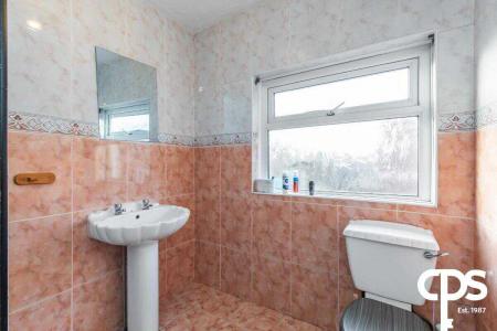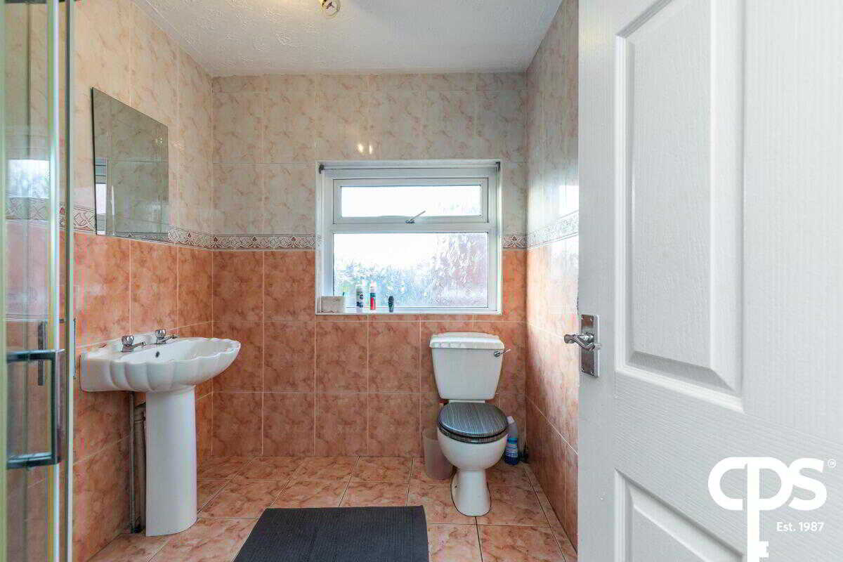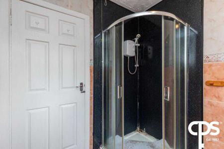 Fully tiled bathroom, corner shower enclosure with PVC panelling surround, electric shower with wand attachment, wash hand pedestal basin and low flush WC.