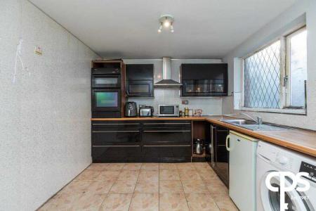 Tiled flooring, range of high- and low-level units, integrated double oven, integrated 4 ring ceramic hob, brushed stainless steel cooker hood, stainless steel sink with drainer, chrome effect mixer tap, undercounter space and plumbing for a washing machine, undercounter space for a fridge, single panel radiator.