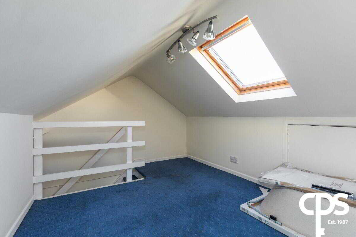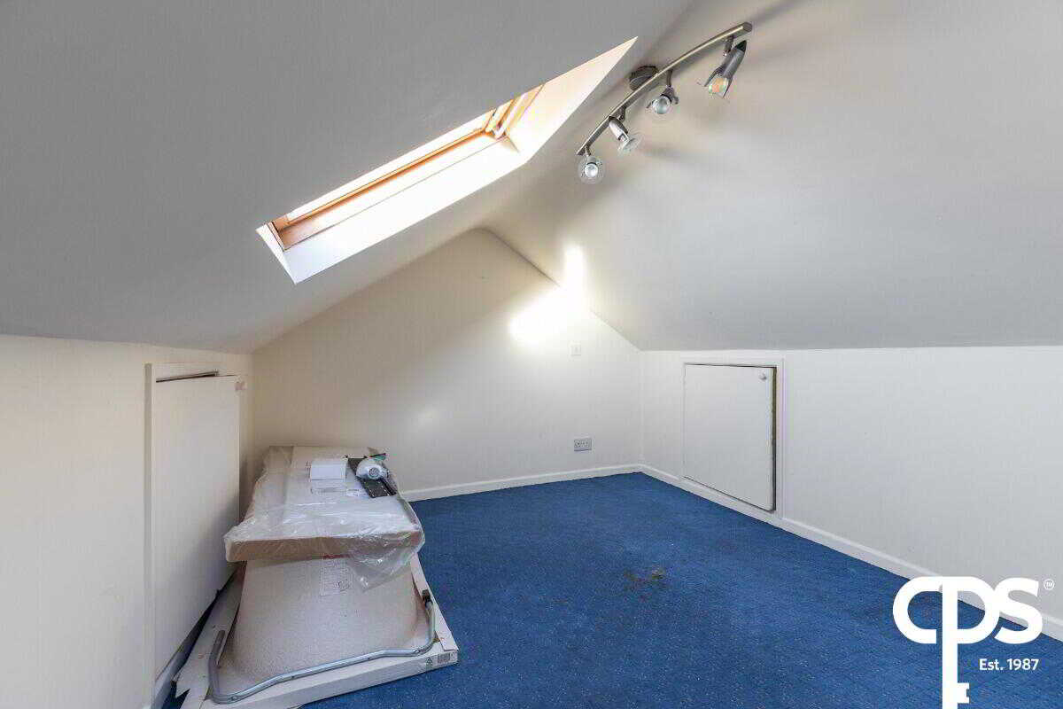 Fitted carpet, Velux window, ceiling spotlights, eaves storage cupboards