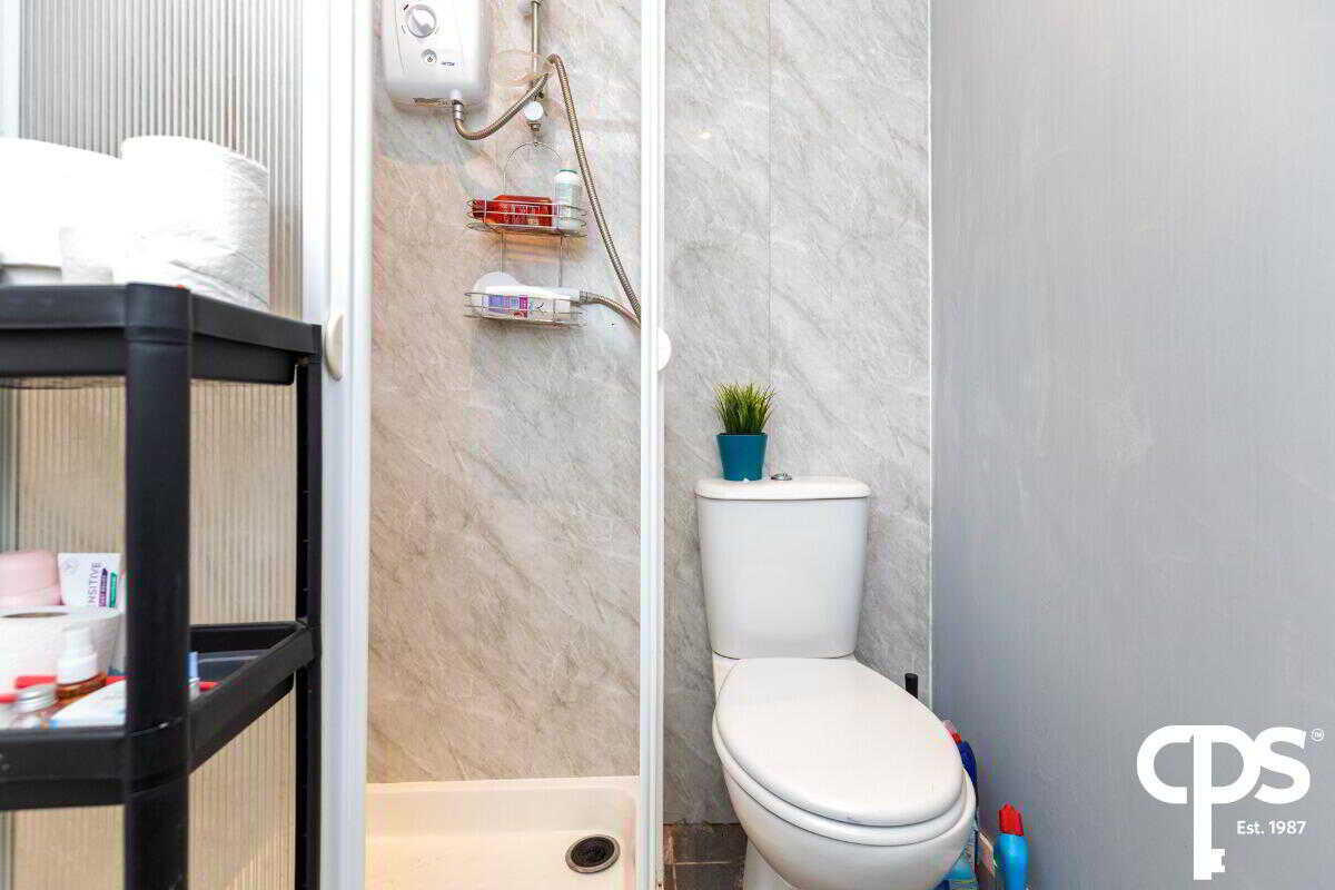 Tile flooring, white corner shower suite with PVC panelling, electric shower, low flush WC, wash hand basin, extractor fan.