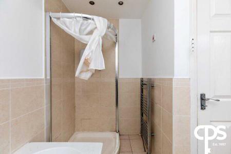 Bathroom comprising bath, WC, corner shower, wash hand basin and chrome towel radiator.