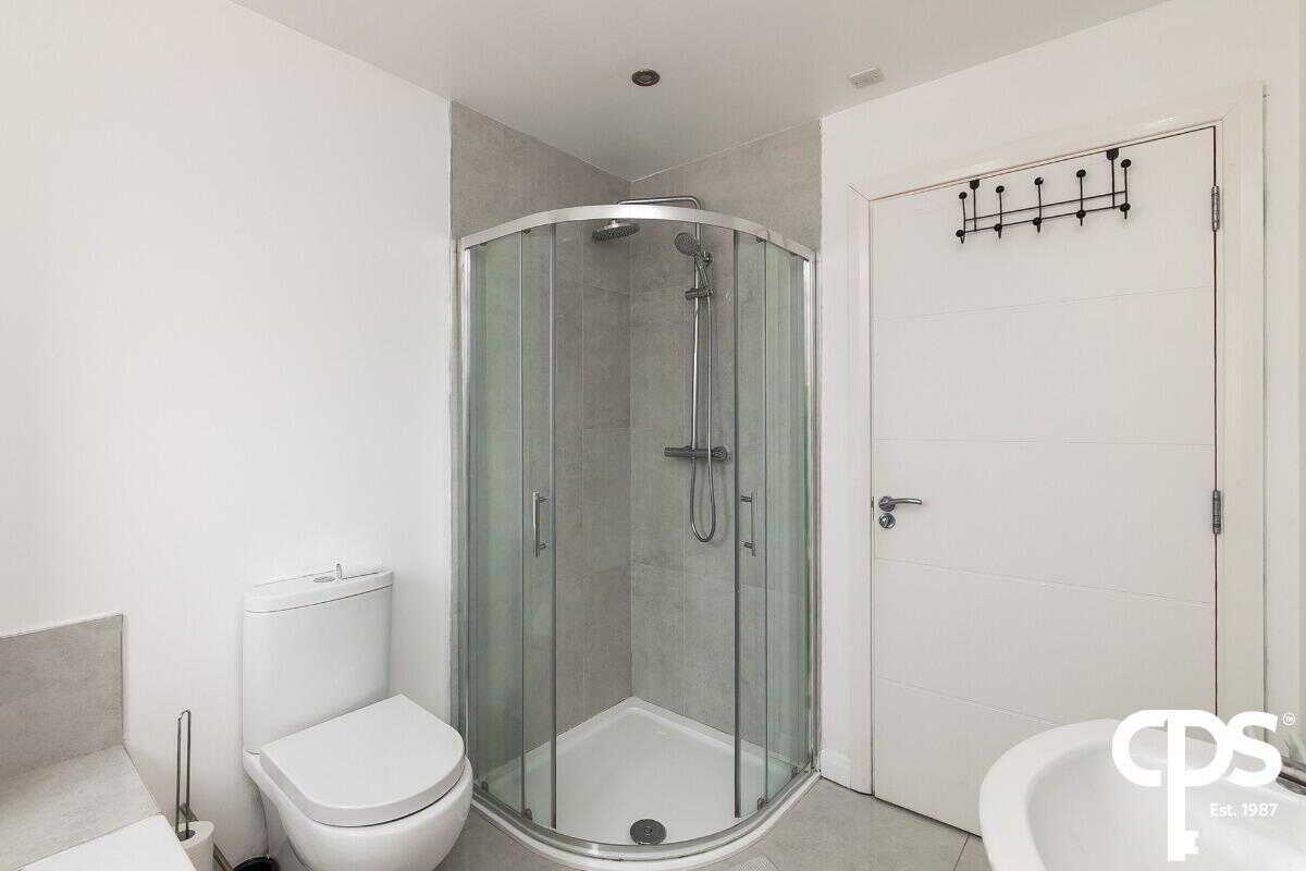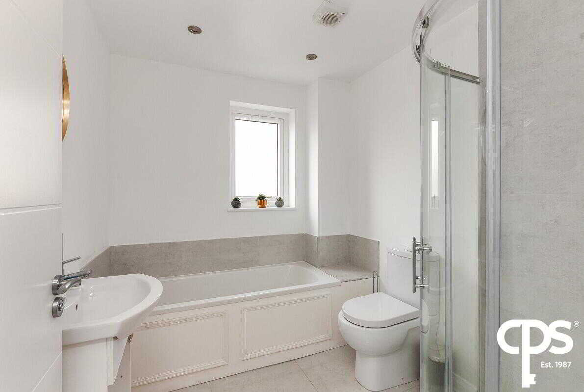 Comprises of an enclosed shower cubicle, low flush WC, white pedestal hand basin.