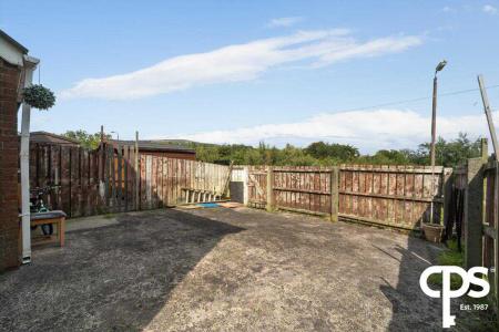 Paved rear with wooden panel fence and pedestrian gate.