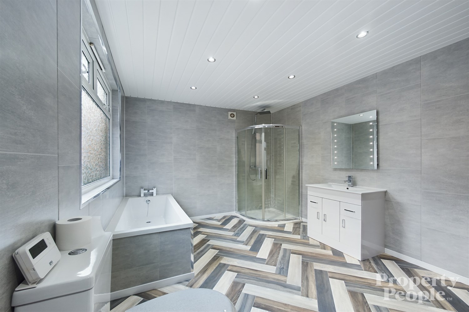 Modern family bathroom suite comprising of a separate bath with mixer taps, enclosed corner shower cubicle with mains shower, low flush w.c, wash hand basin with vanity unit. Stainless steel vertical radiator and extractor fan.