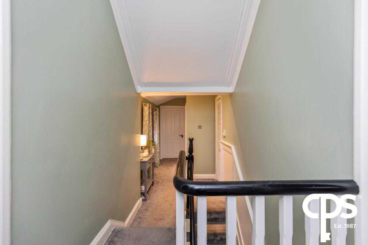 Carpeted, traditional solid banister and handrail, feature wall panelling, and ceiling cornicing.