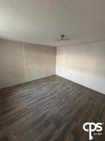 Spacious living area with neutral décor and laminated wooden flooring.
