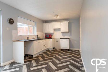 Range of high- and low-level units, laminate worktops, stainless steel sink, vinyl flooring, plumbed for washing machine, access to the rear.