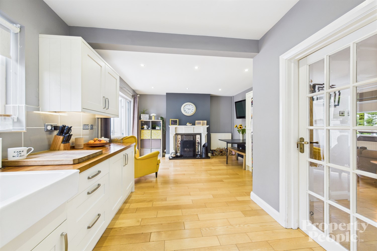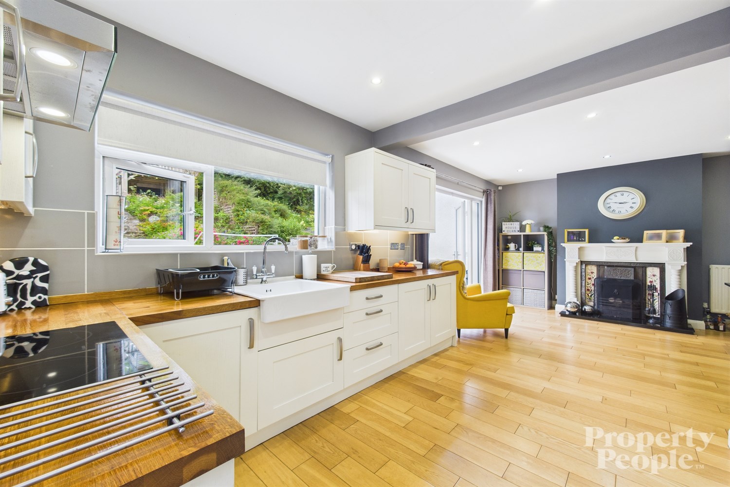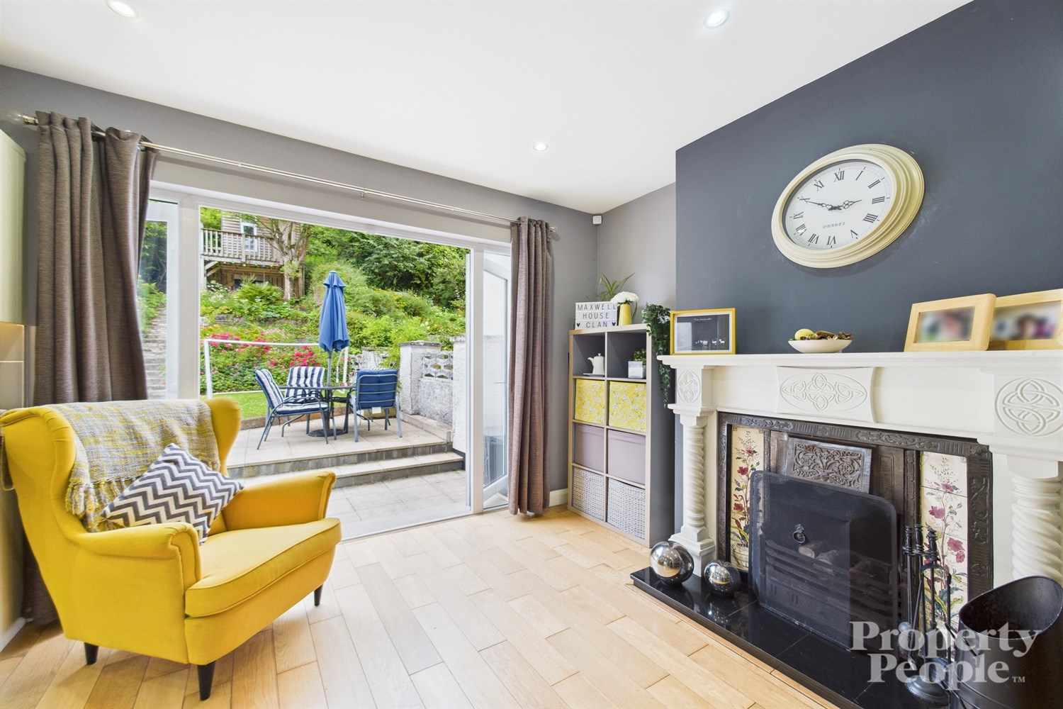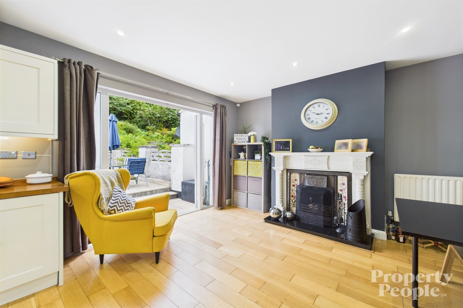 - A bright and spacious dining area with feature open fireplace & double doors to rear garden