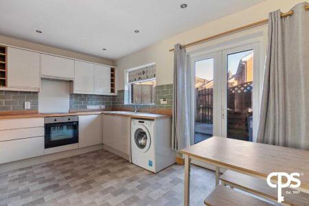 The kitchen area is fully fitted with a range of high- and low-level units for generous storage space and formica worktops. The kitchen includes a built-in oven, ceramic hob , extractor fan and dishwasher. The dining space comprises vinyl flooring and French doors to the enclosed rear yard.